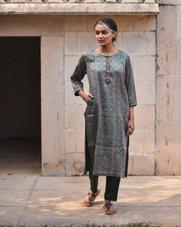 Collide your style in the luxurious affair of mashru silk with this scintillating set of kurta and bottom. Featuring easy silhouettes, and geometric block print patterns. An ideal look for your indie fashion choices. Inspiration: Contrived in the beauty of Mashru fabric, this artistic collection is a perfect blend of urban vows with traditional soirees. Design to encapsulate your vogue with opulent dreams.