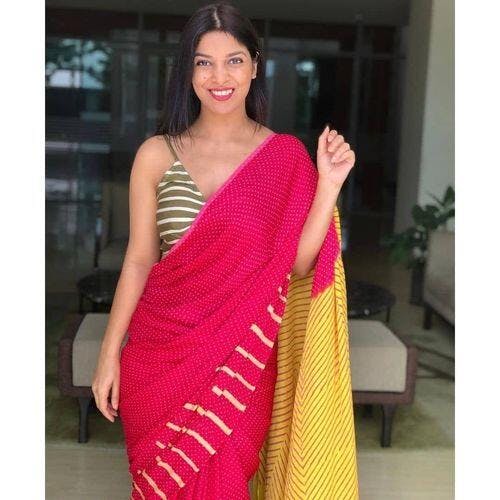 Embrace the colours and positivity in our pure handmade, blockprinted modal silk saree