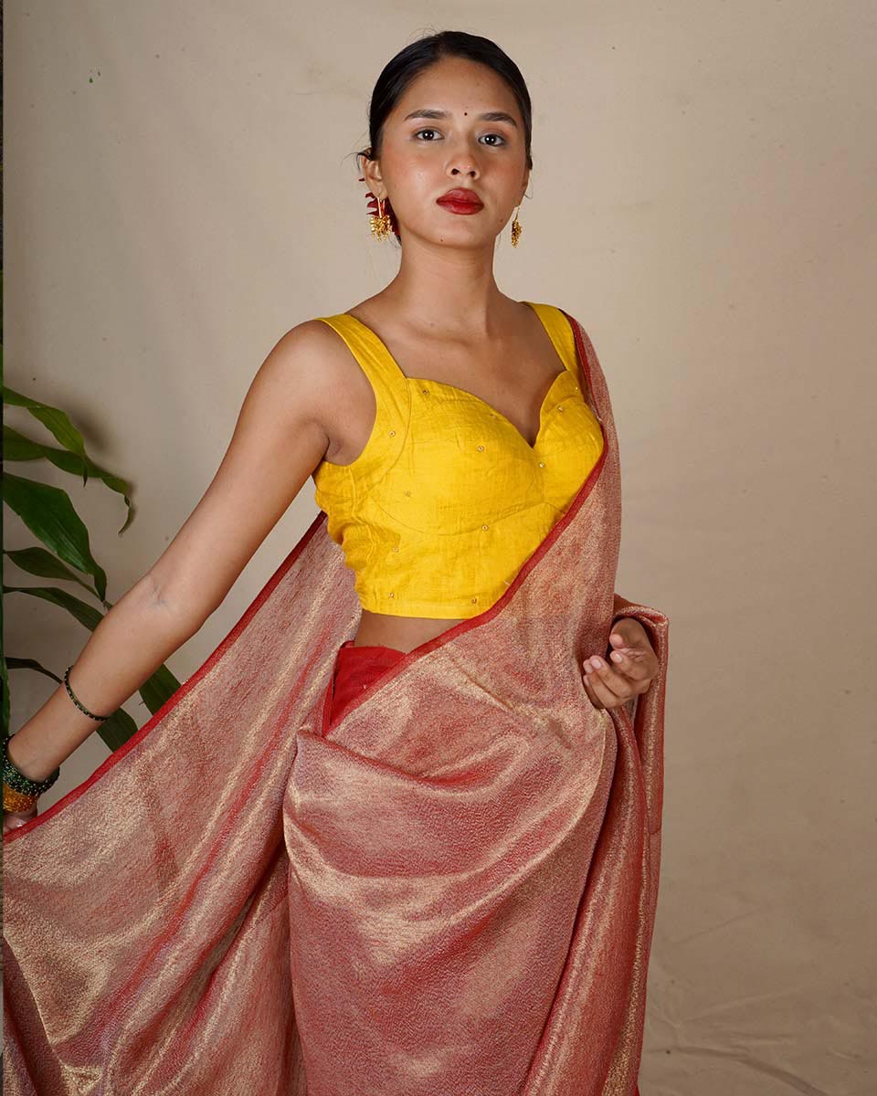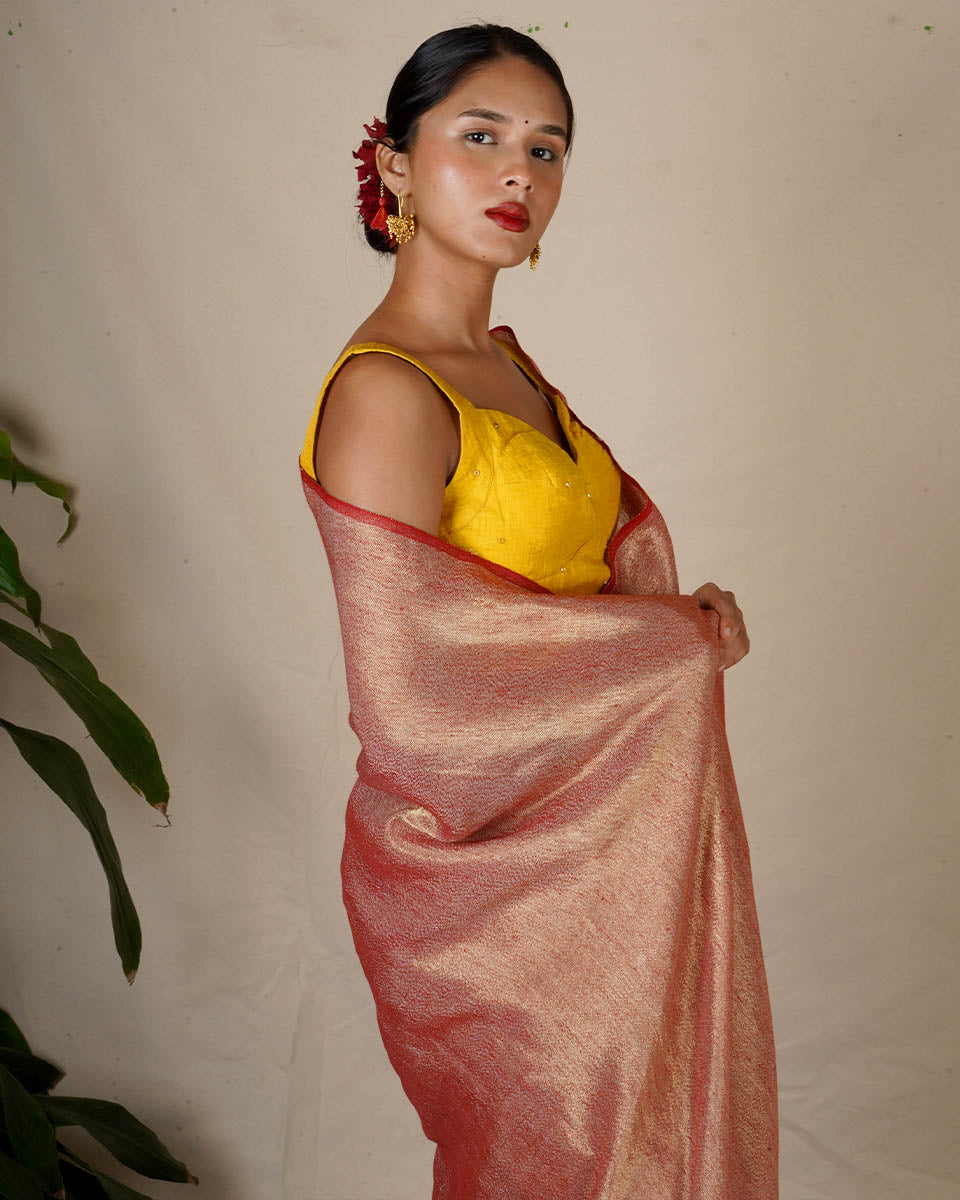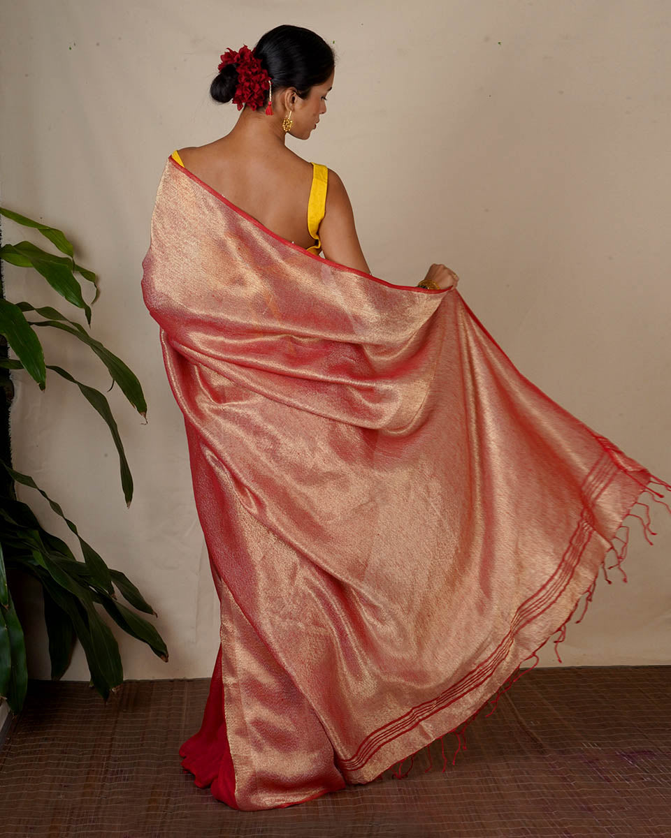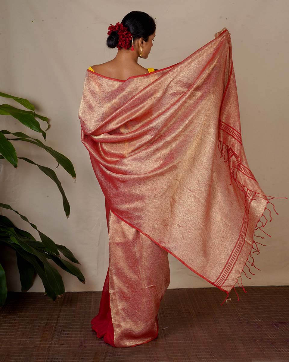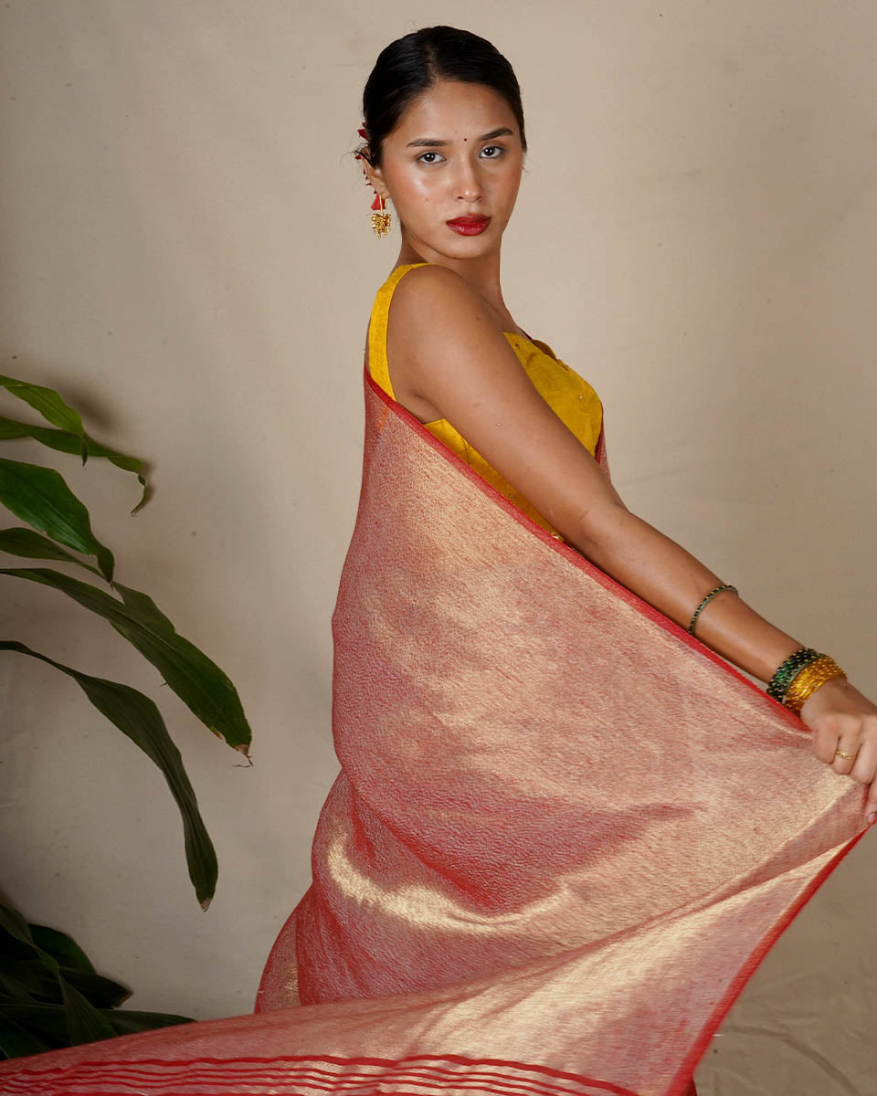 Introducing the Abhati Red Handwoven Linen Zari Saree, a stunning fusion of comfort and sophistication that celebrates the art of traditional weaving. Made from premium linen, this saree offers a lightweight, breathable experience that drapes elegantly, making it an ideal choice for any occasion, be it a family gathering, a wedding, or a festive celebration.