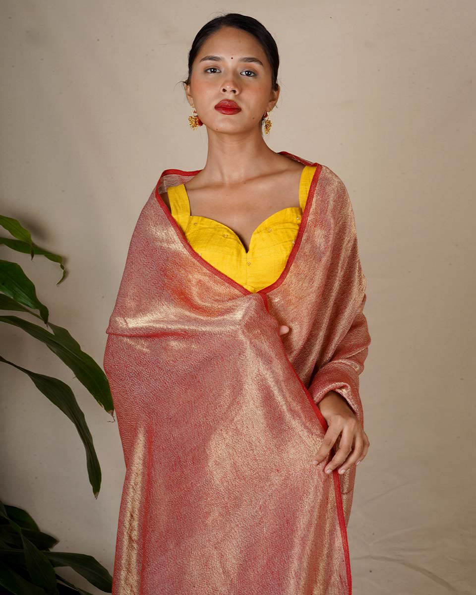 What sets the Abhati saree apart is its exquisite zari work, intricately woven into the fabric by skilled artisans. The shimmering threads of gold add a touch of opulence, creating a captivating contrast against the rich, textured linen. Each saree is a testament to meticulous craftsmanship, with handwoven details that make every piece unique.