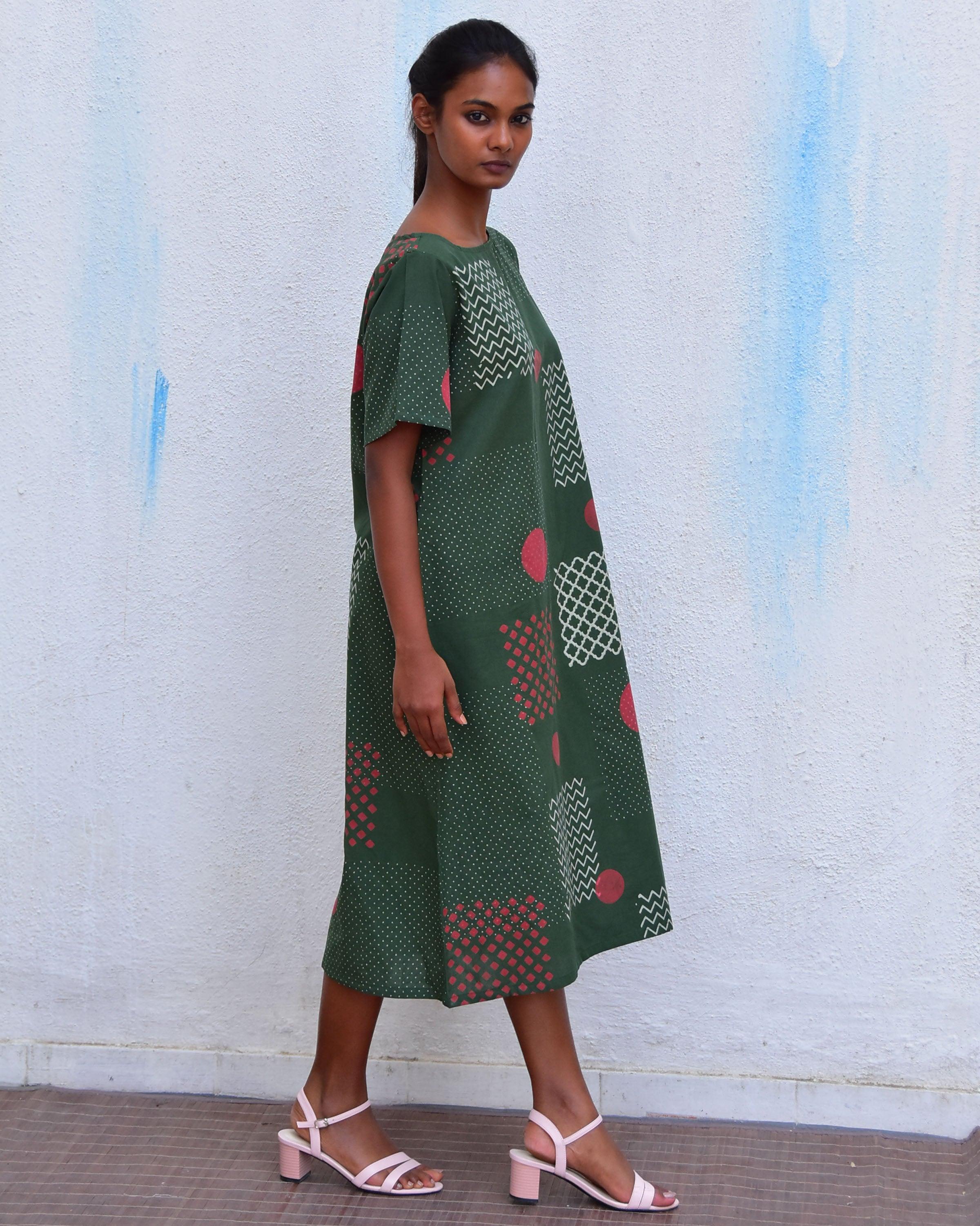 Immerse yourself in the vibrant beauty of nature with our "Smell of Rain" collection's green cotton handblockprinted dress. The boat neckline and half sleeves exude elegance, while the intricate white stripes and red circles add a touch of artistry. Embrace the enchantment of nature and radiate confidence with every step you take.