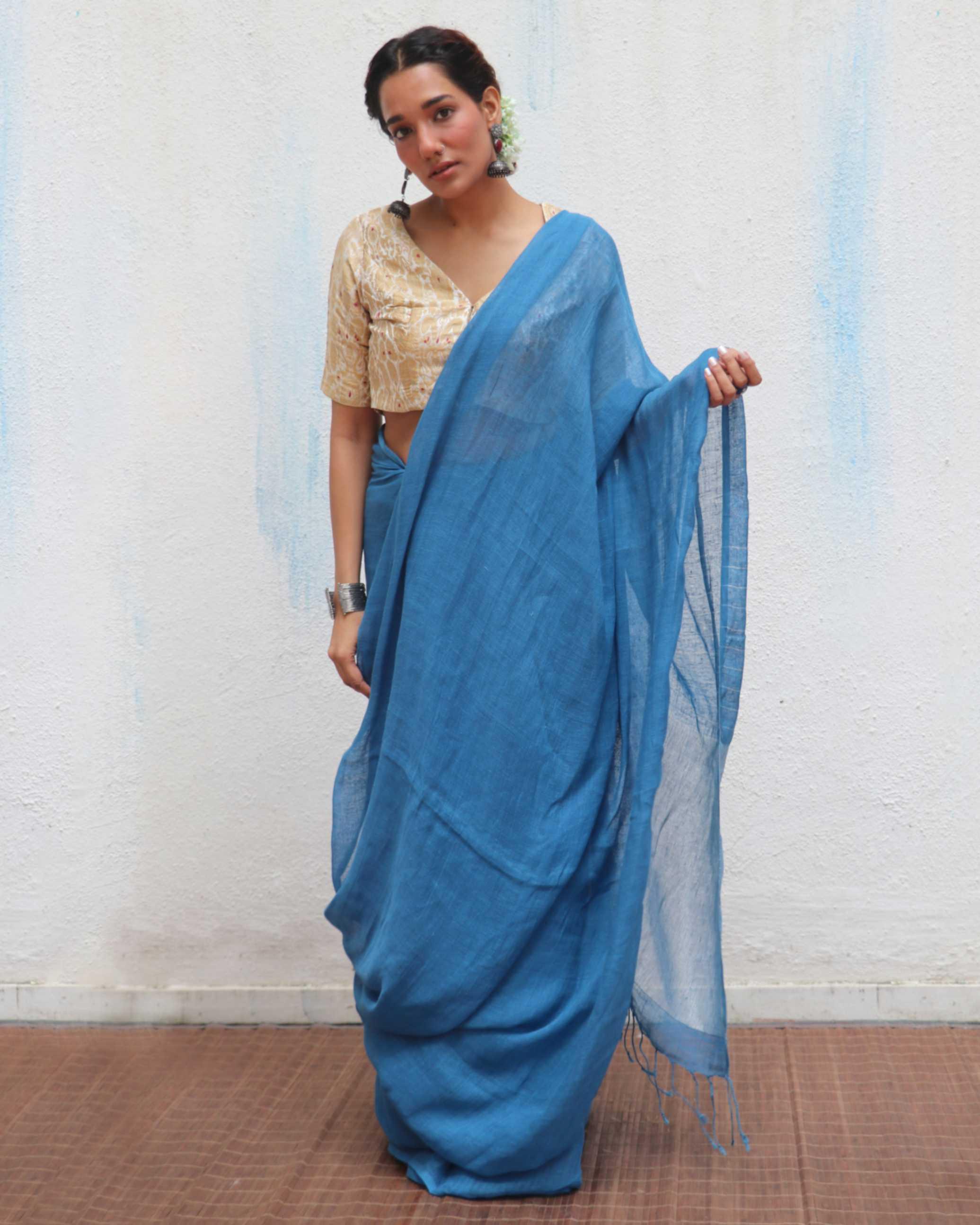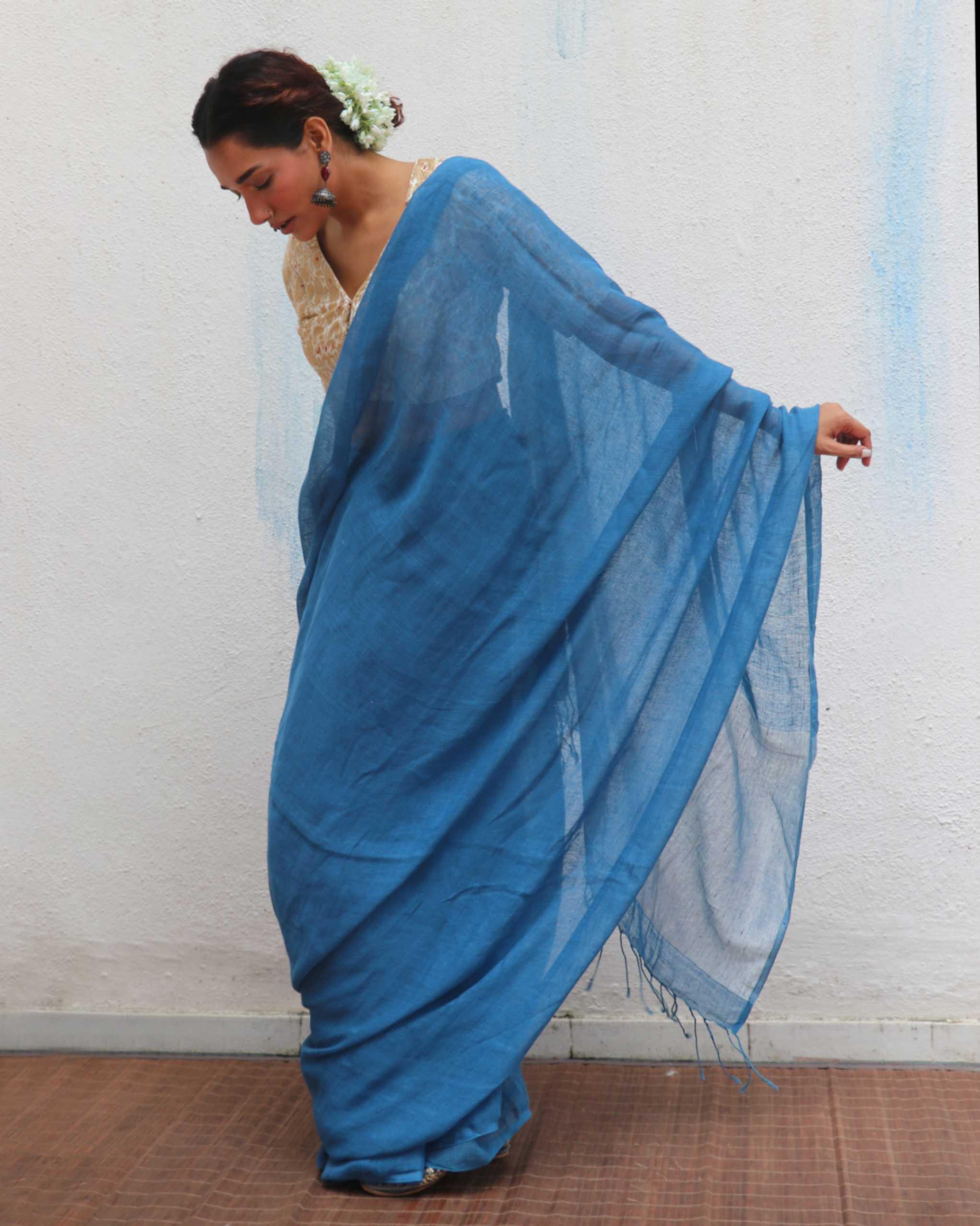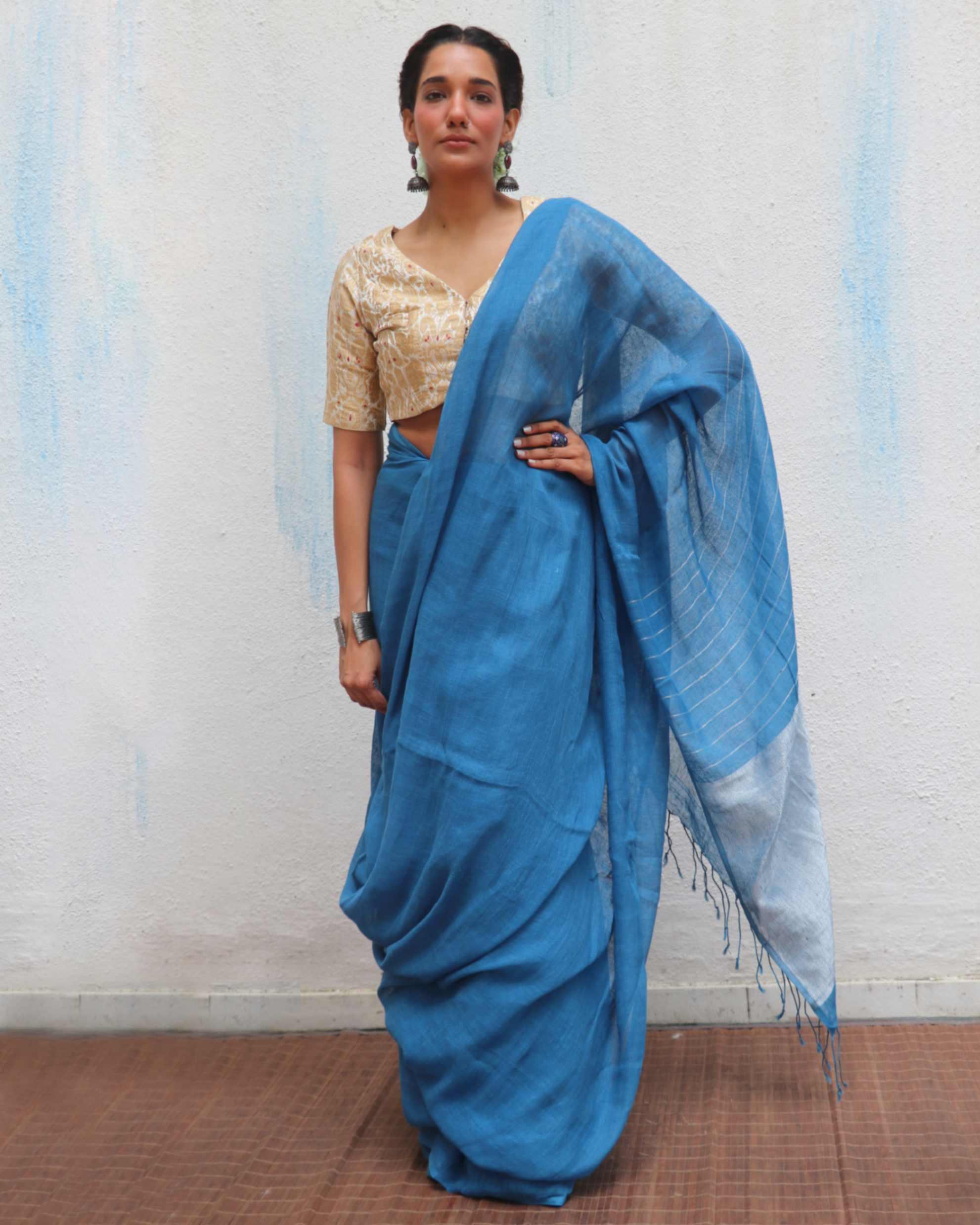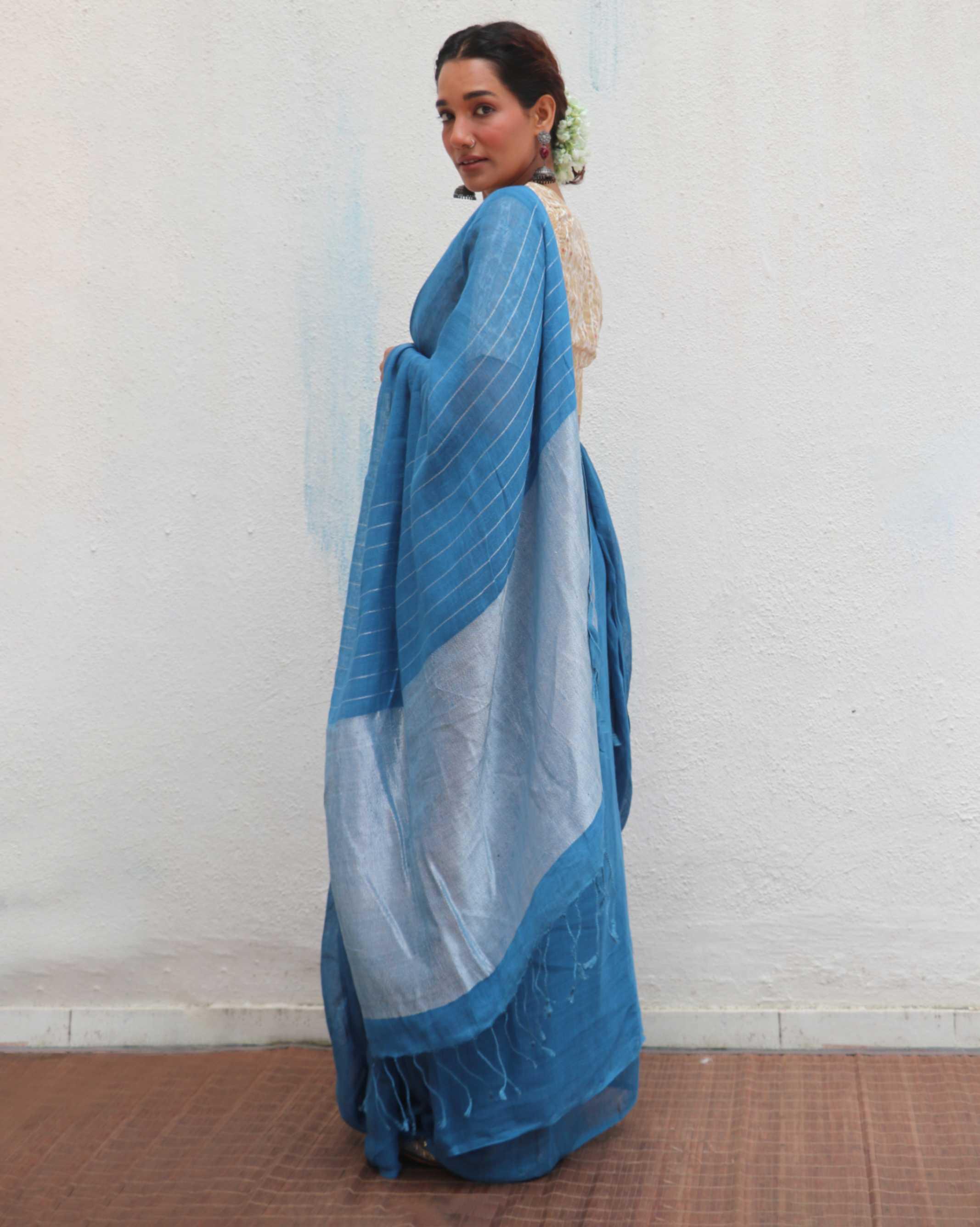 In line with the growing popularity of linen sarees, this saree is more than just attire; it's an expression of timeless grace and traditional craftsmanship. The Barkha Handwoven Linen Zari Saree is ideal for those who appreciate the beauty and versatility of handwoven linen sarees, offering a sophisticated and versatile option for any wardrobe.