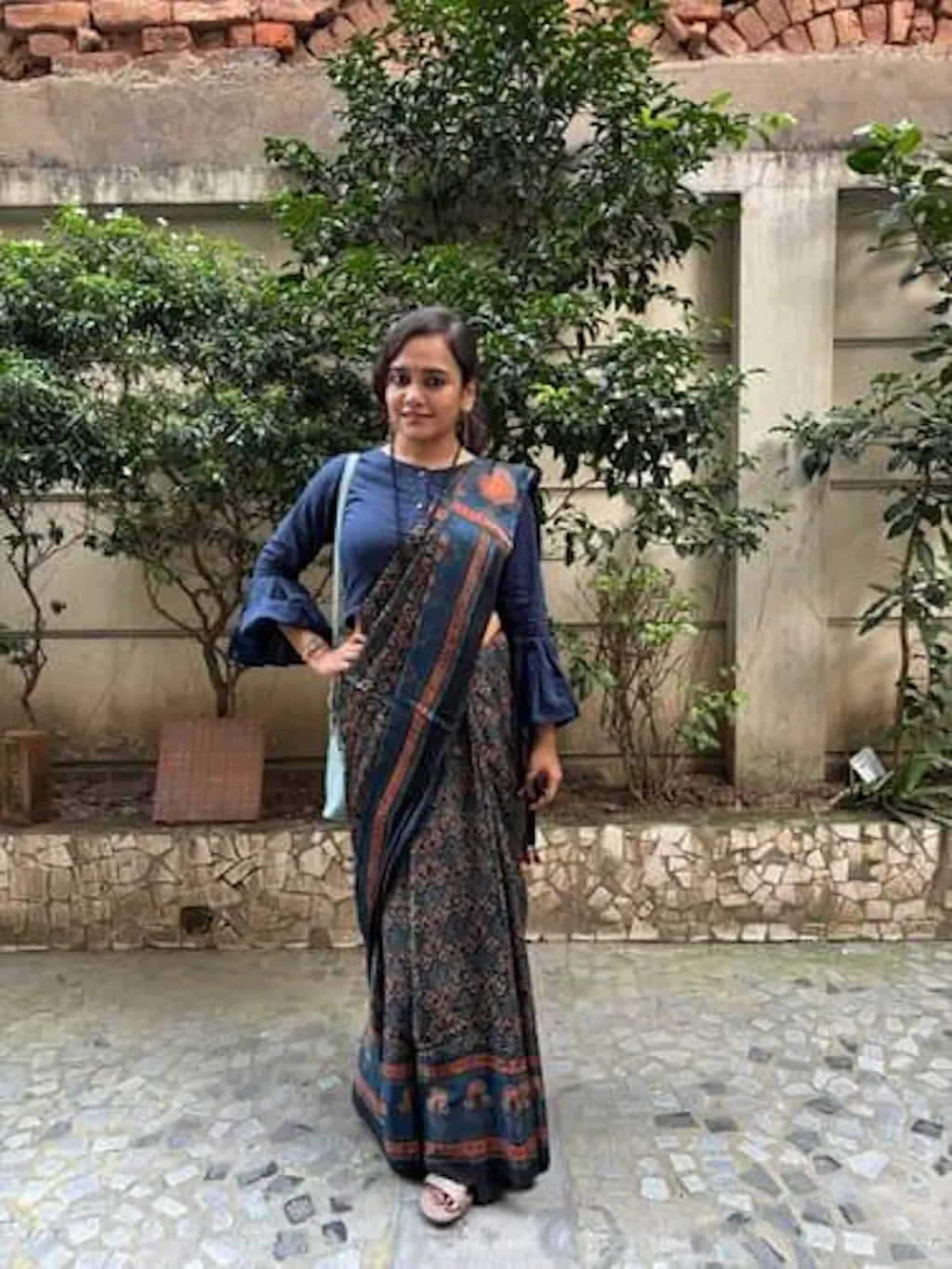 Make your style at ease with this blue block printed crop top on cotton base. Followed by round-neckline, bell sleeves and front button opening. All design to lend your vogue a comfy yet stylish feel. An ideal companion to guide along with your traditional drapes, skirt, or any regular denim.