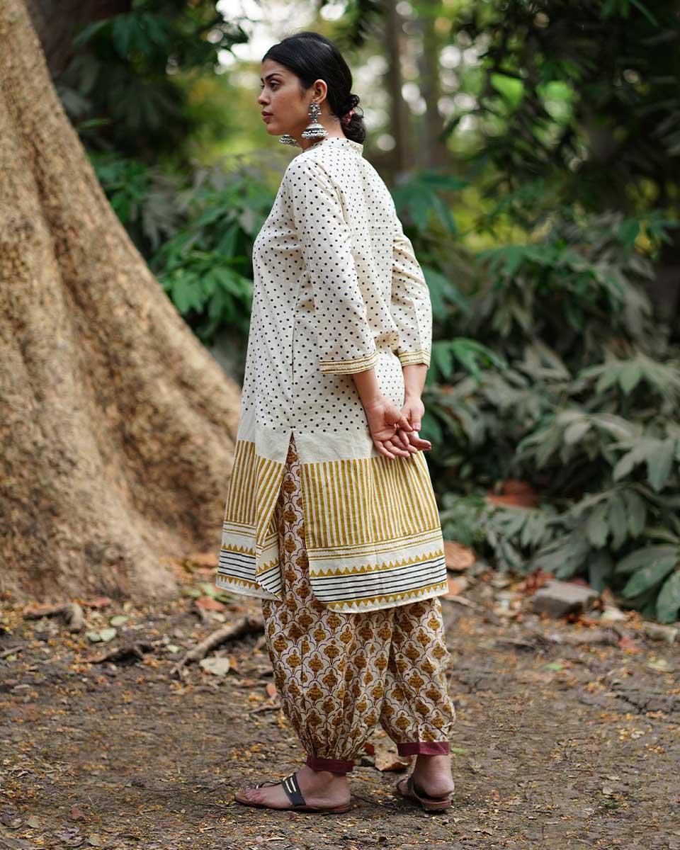 This kurti, which is crafted of soft, breathable cotton, combines comfort and subtle elegance. The warm glow of golden sunlight filtered through woodland canopies is evoked by the exquisite contrast between the mustard highlights and the calming ivory background.