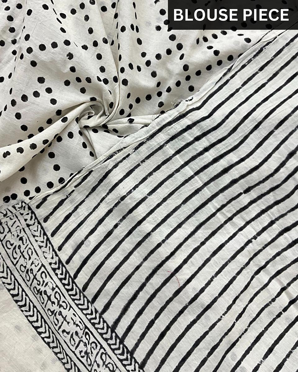 Behold the Ivory Black Block Printed Cotton Mul Mul Saree, a timeless canvas of classic elegance. This cotton saree, meticulously handcrafted, artfully melds the pristine allure of ivory with the refined sophistication of black through delicate block prints. Draping yourself in this cotton saree is like enveloping yourself in a timeless tale, where grace and tradition harmonize, thanks to the gentle embrace of the soft and breathable cotton mul mul fabric. Whether you're preparing for a special event or a laid-back get-together, this Ivory Black Block Printed Cotton Saree seamlessly weaves the threads of age-old charm and contemporary style, ensuring you radiate sophistication and comfort with every graceful fold.
