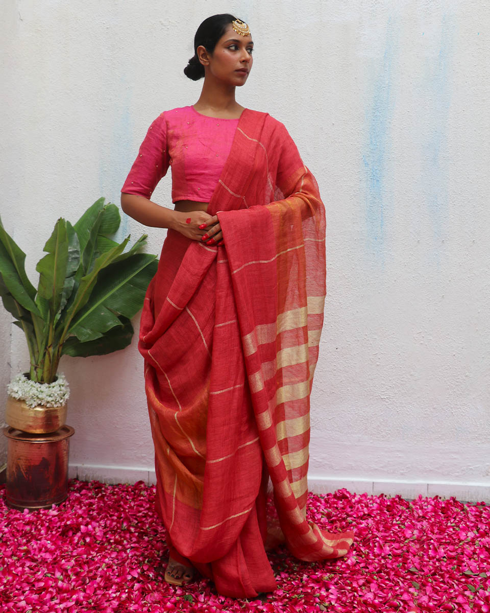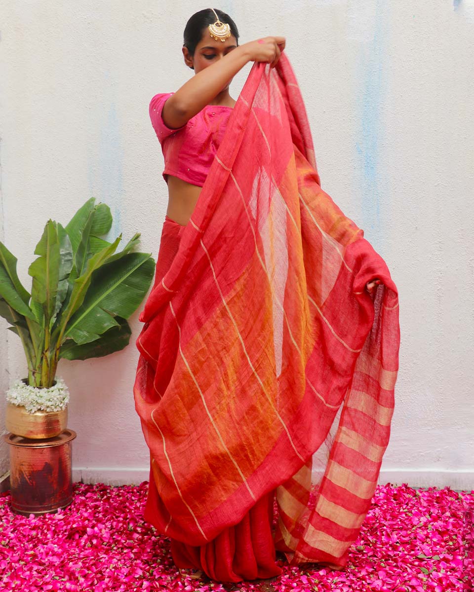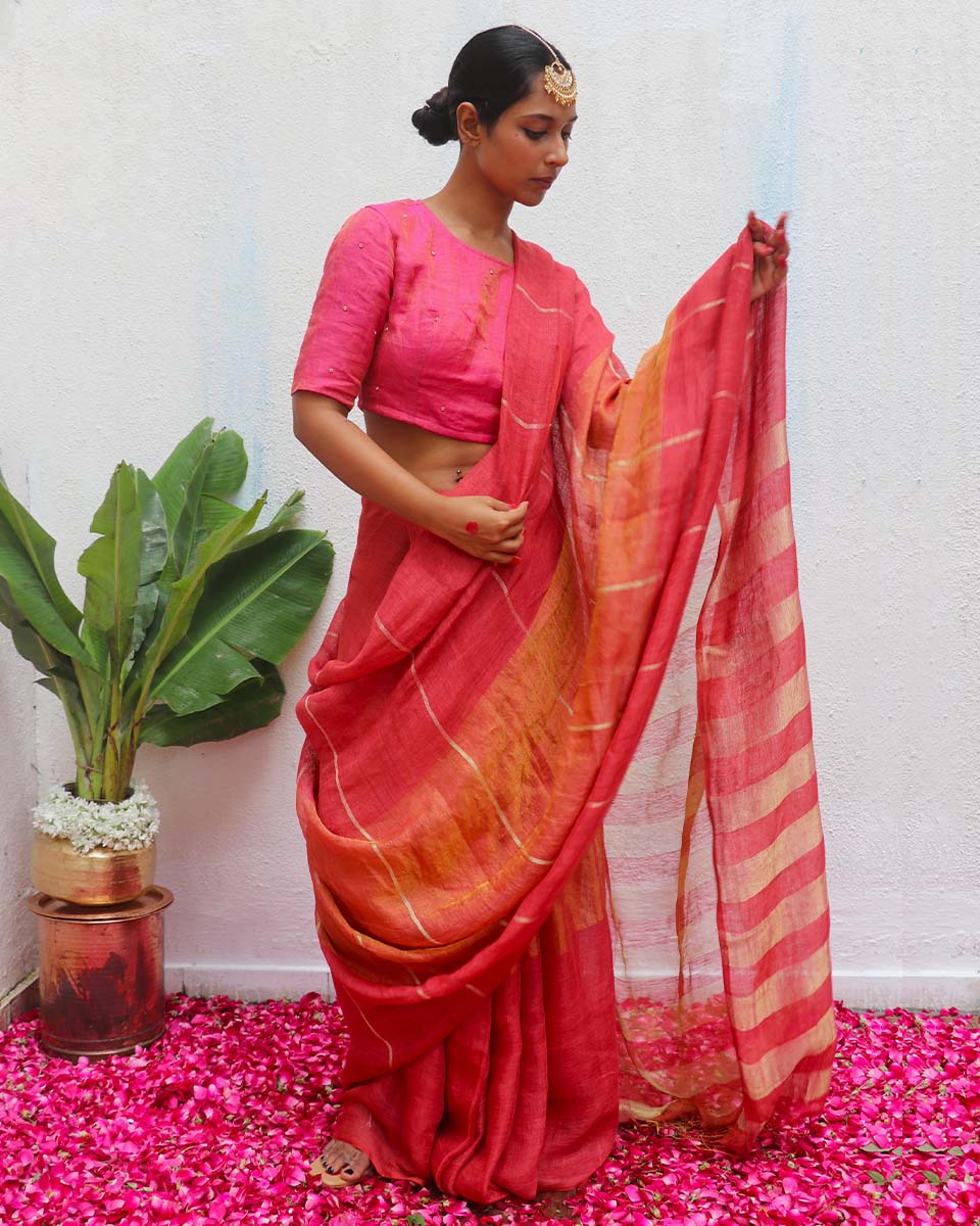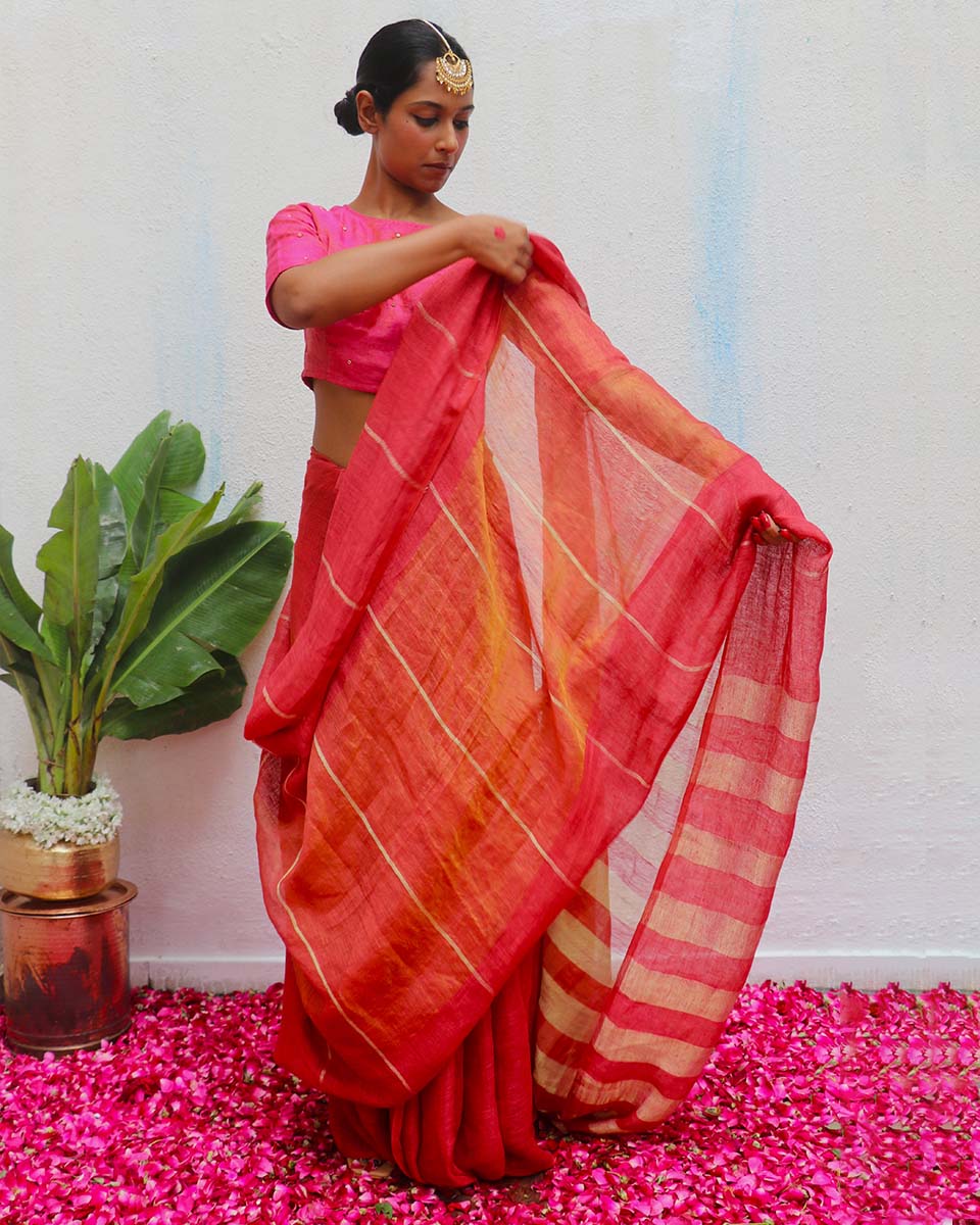 The intricate zari work adds a touch of luxury, with delicate golden threads that shimmer against the rich texture of the linen. Each piece is handwoven by skilled artisans, ensuring that every saree is unique and tells a story of craftsmanship and heritage. The subtle sheen of the linen fabric complements the opulent zari detailing, creating a harmonious balance that is both eye-catching and sophisticated.