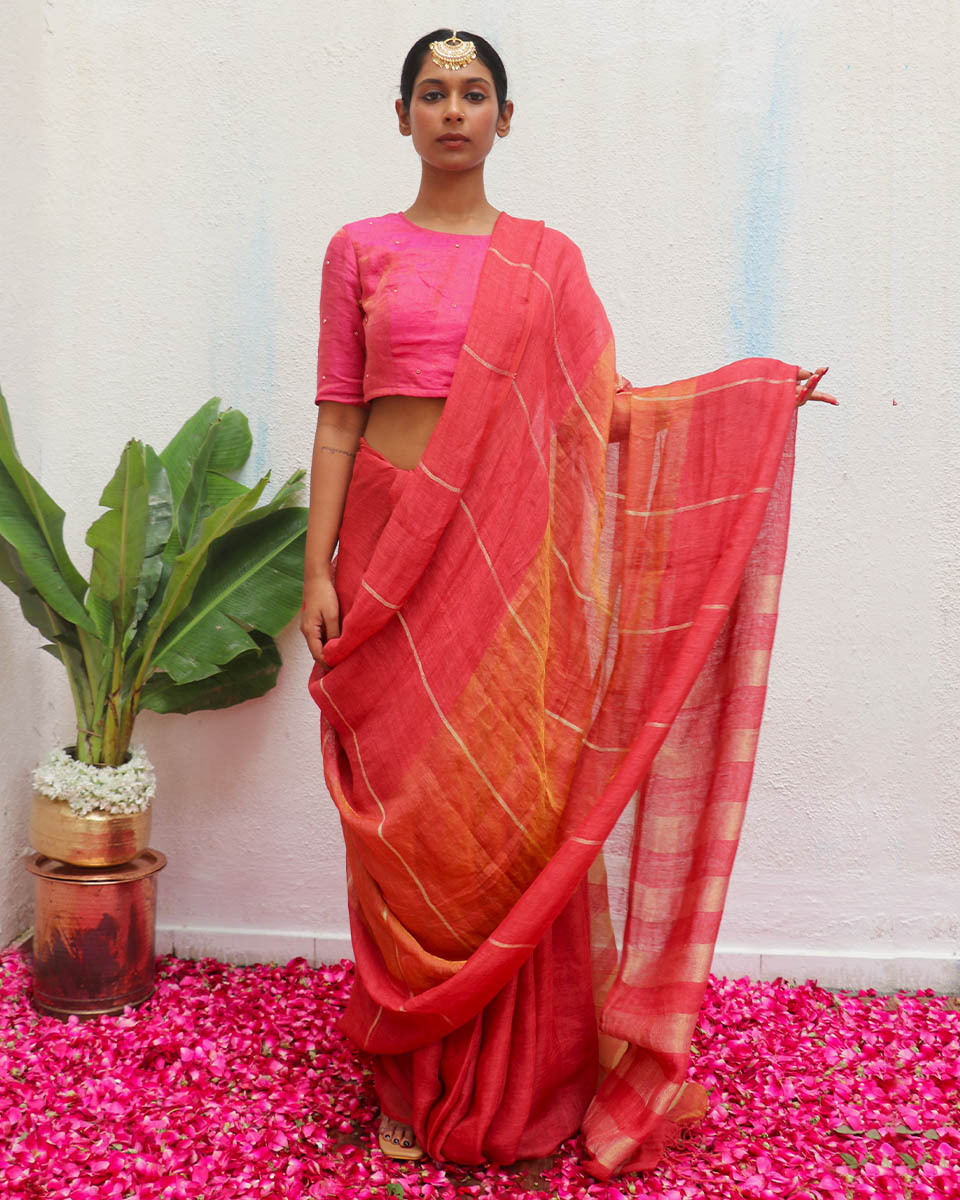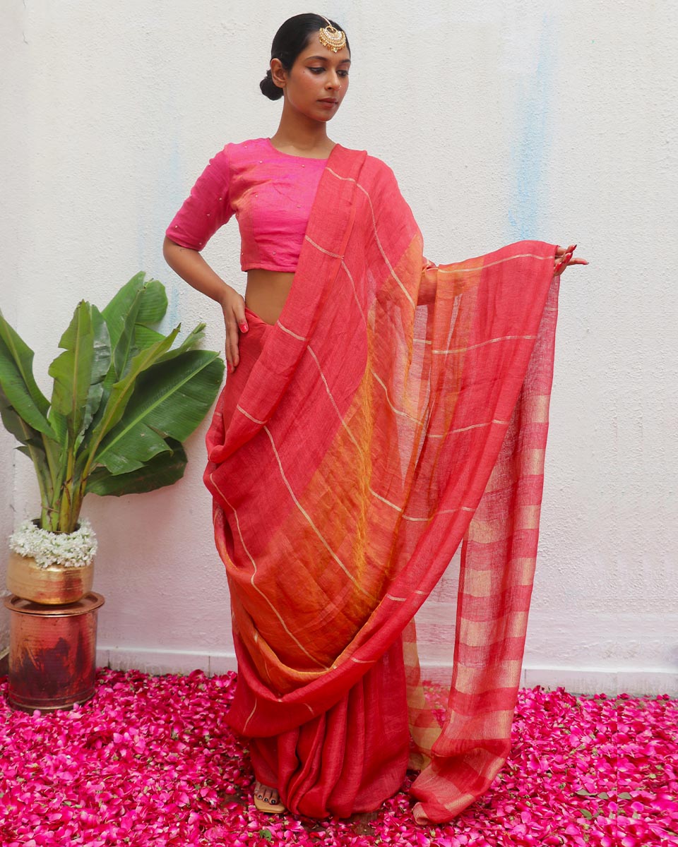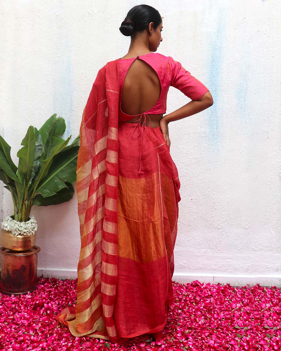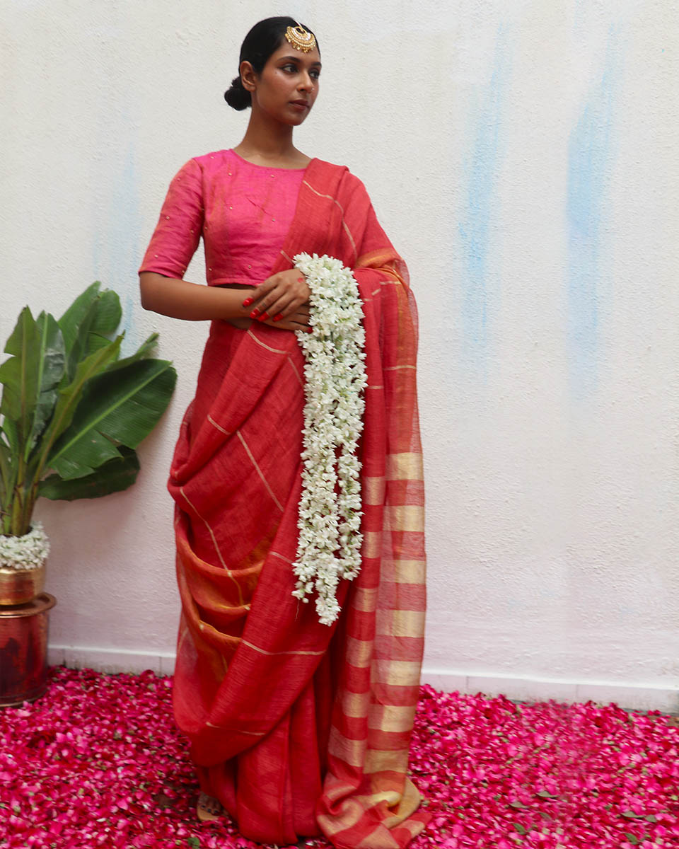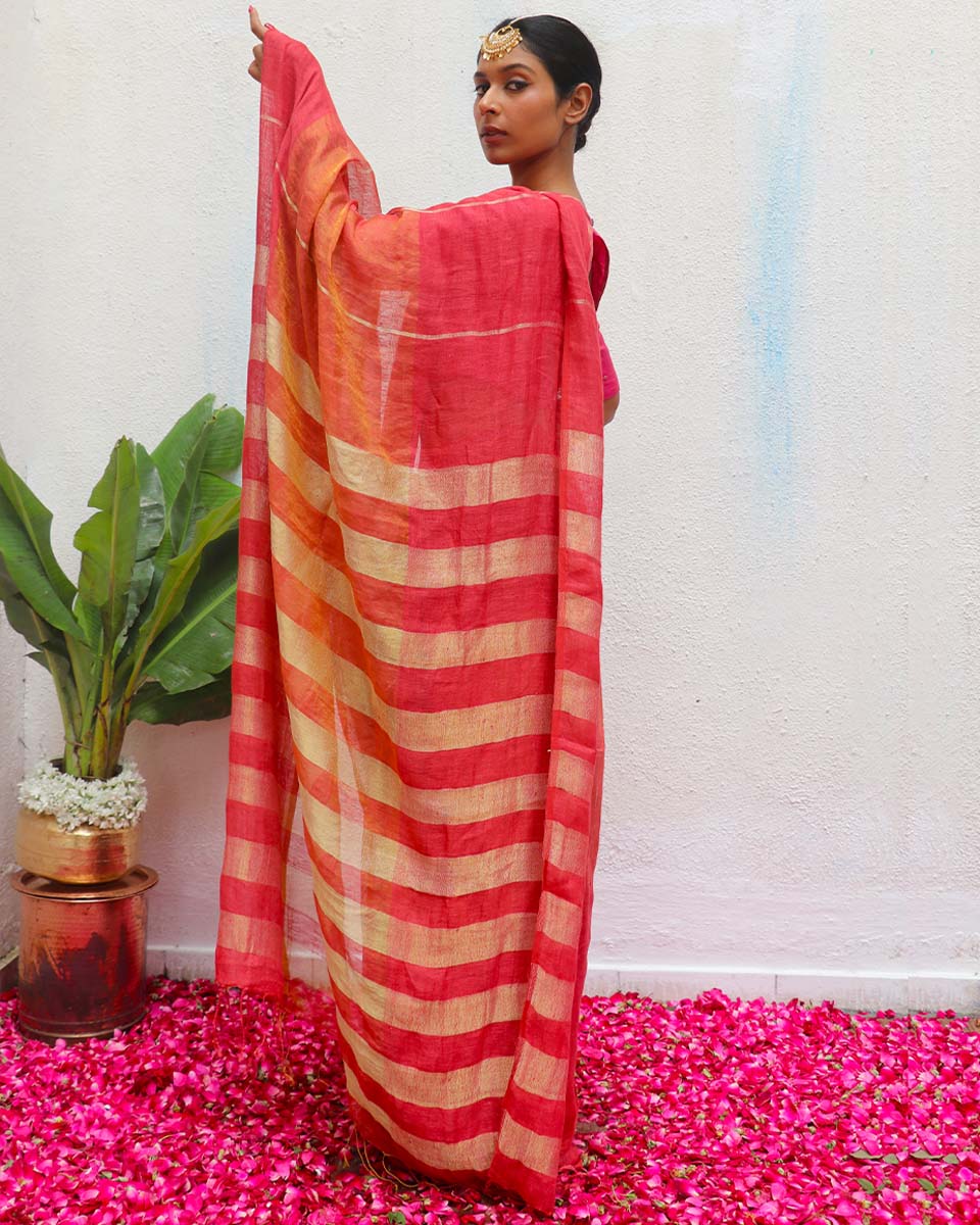 The intricate zari work adds a touch of luxury, with delicate golden threads that shimmer against the rich texture of the linen. Each piece is handwoven by skilled artisans, ensuring that every saree is unique and tells a story of craftsmanship and heritage. The subtle sheen of the linen fabric complements the opulent zari detailing, creating a harmonious balance that is both eye-catching and sophisticated.