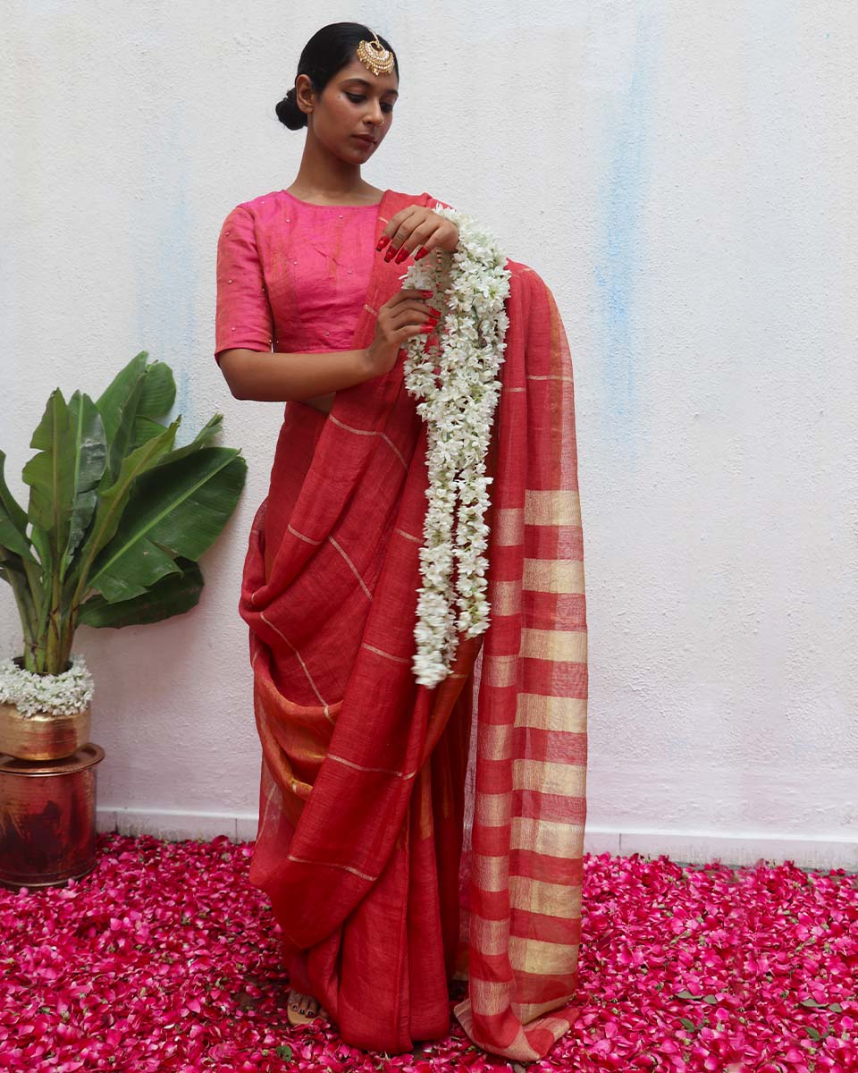 Jyotsna Maroon Handwoven Linen Zari Saree