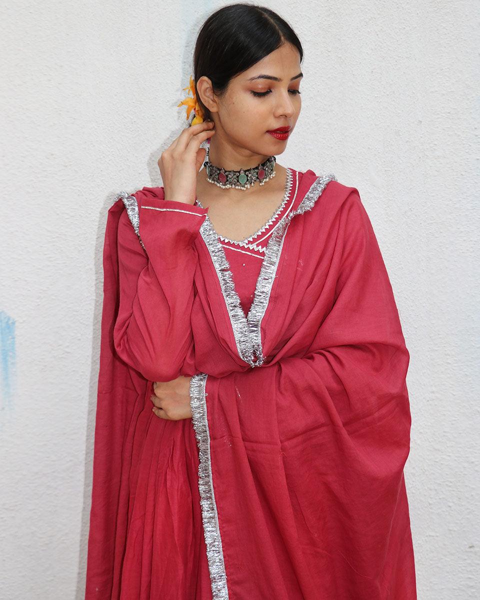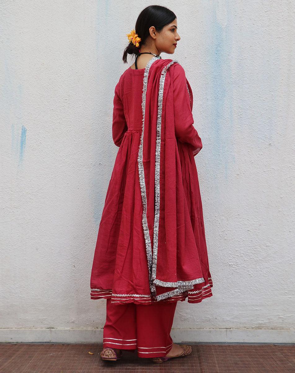 Kusum Crimson Mulmul Cotton Kurta Set with Dupatta Set of 3 - Jugnoo