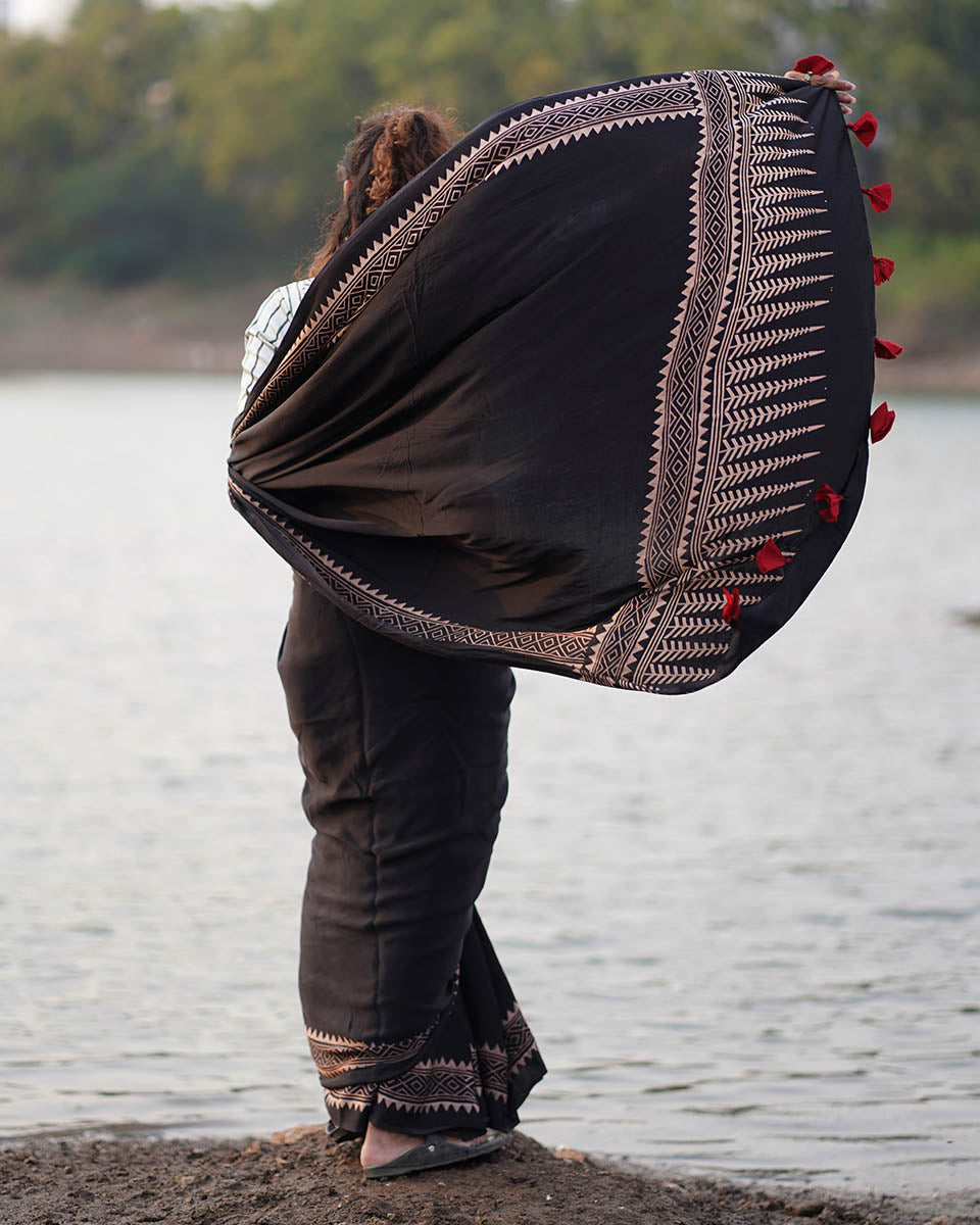 Discover the enchanting beauty of the Mansi Black Block printed Modal Silk Saree, a captivating blend of artistry and sophistication. This stunning saree is crafted from premium modal silk, offering an exquisite drape that feels luxurious against the skin while ensuring all-day comfort.