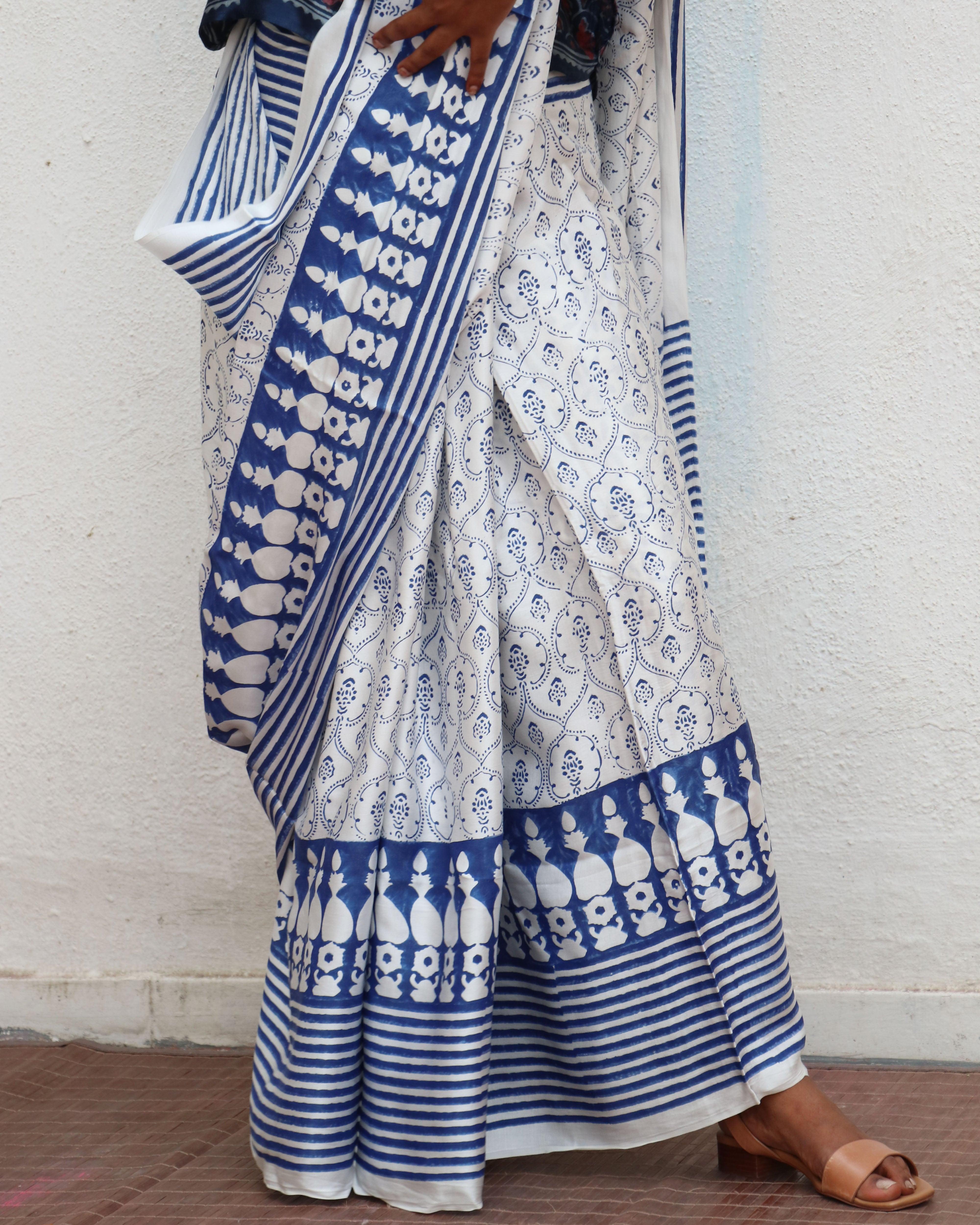 The Mia Kara Blockprinted Modal Silk Saree exudes an aura of timeless elegance and cultural richness. Crafted meticulously from the finest modal silk, this saree is a testament to luxury and sophistication, promising a graceful drape and a regal presence that's perfect for any occasion.