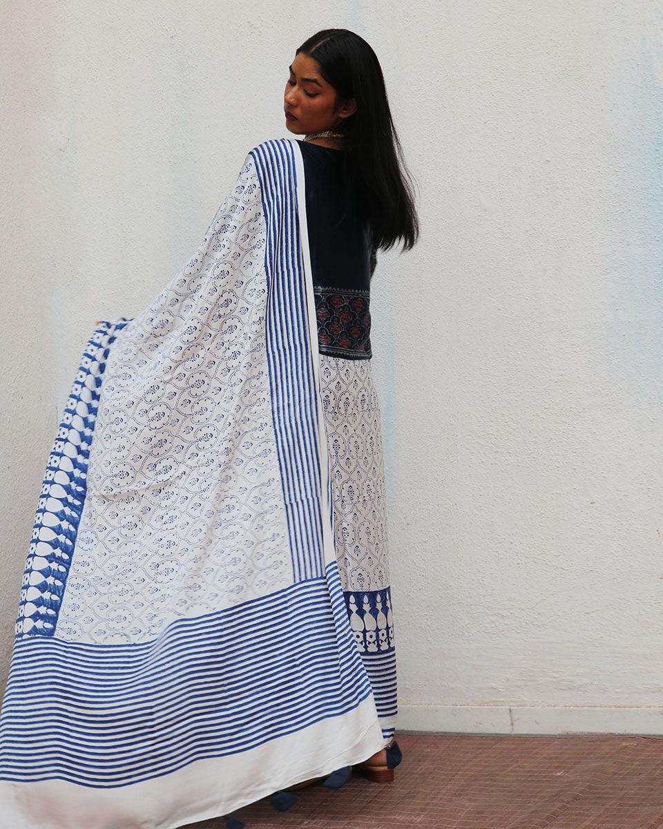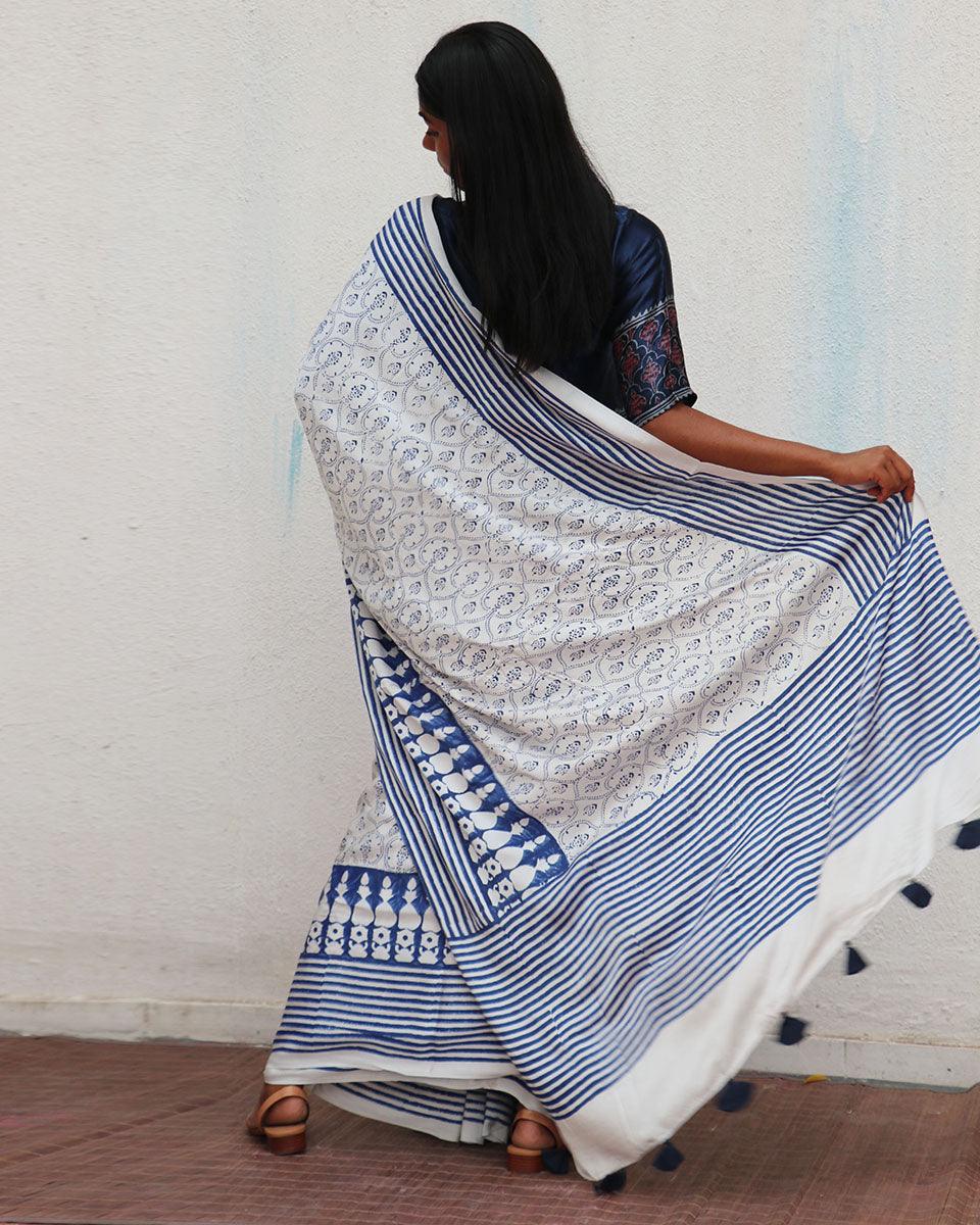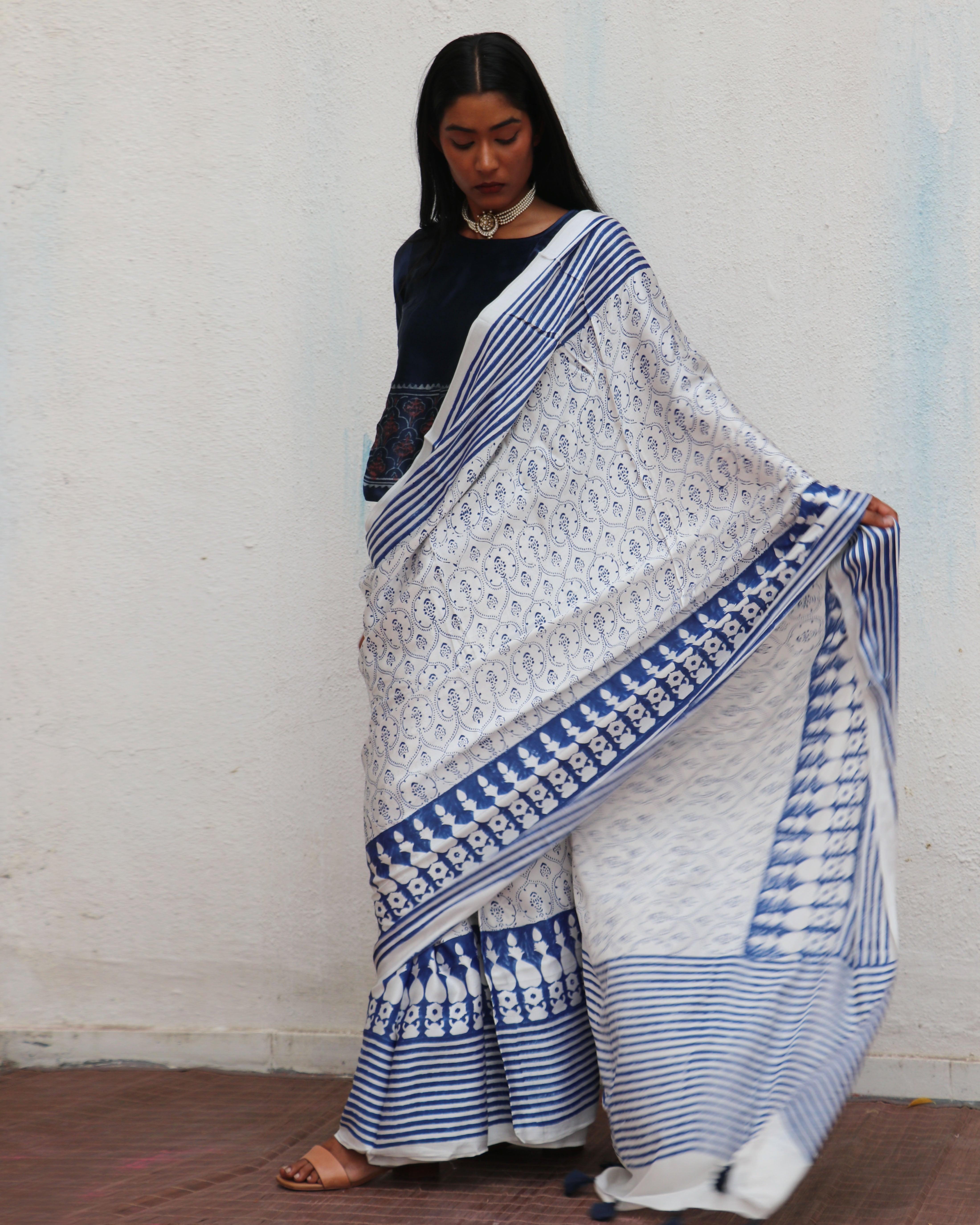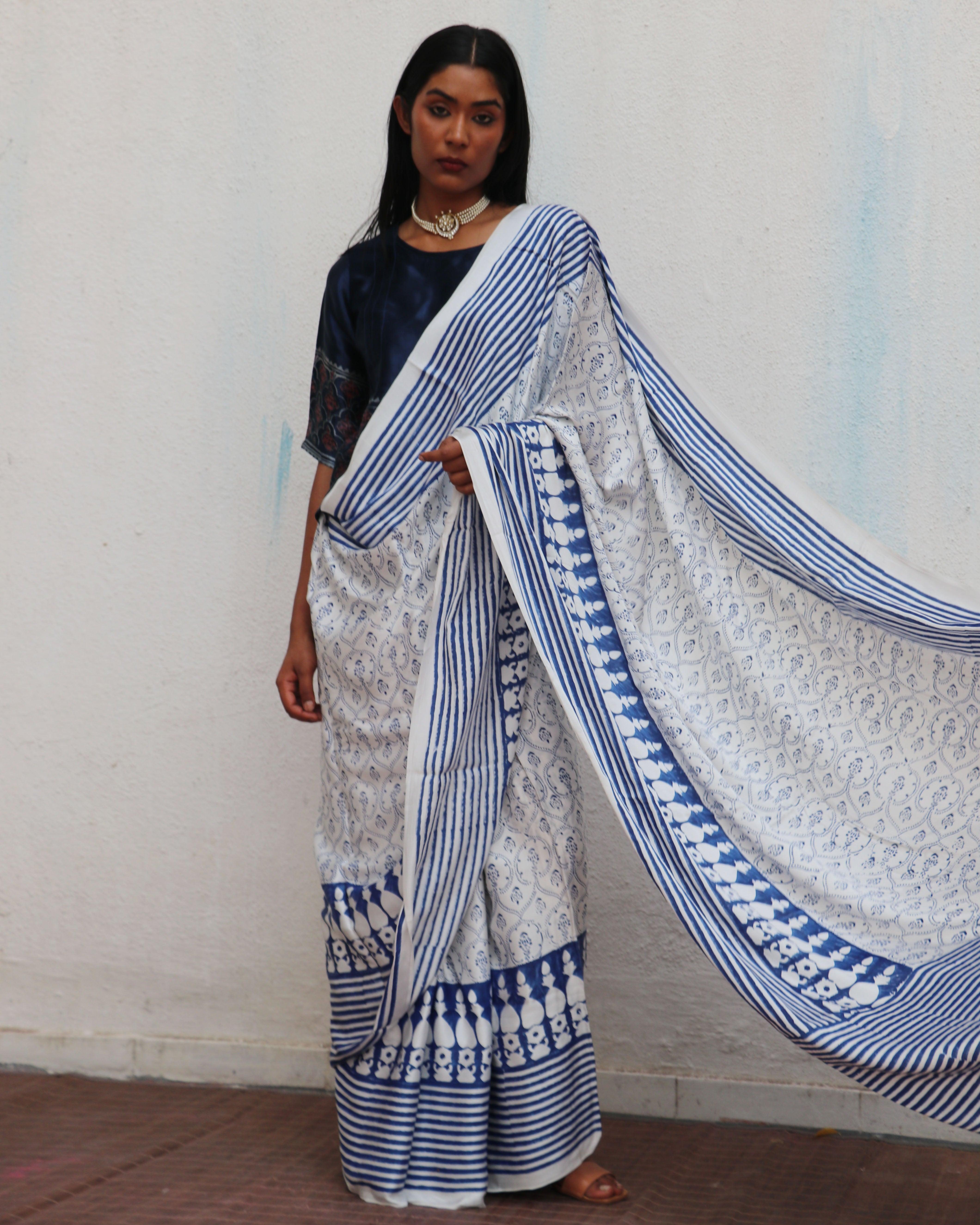 Adorned with intricate blockprinted designs, each saree is a masterpiece of artistry, skillfully handcrafted by talented artisans. The captivating patterns and vibrant hues come together harmoniously, creating a visual symphony that captivates the eye and speaks volumes of tradition and heritage.