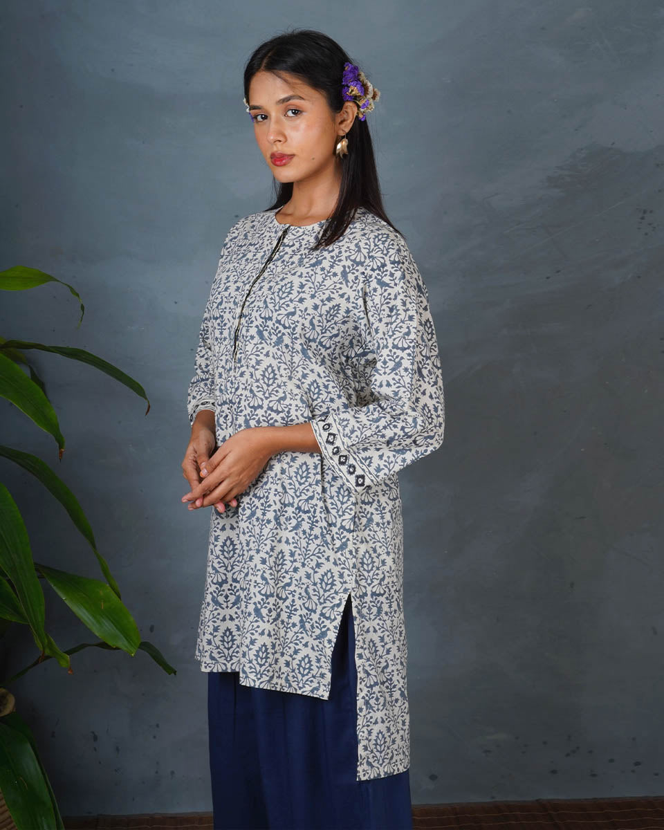 Drift into dreamy comfort with this grey block printed top, a soft, breezy silhouette that pairs effortlessly with any look, made for misty mornings and cozy moments.