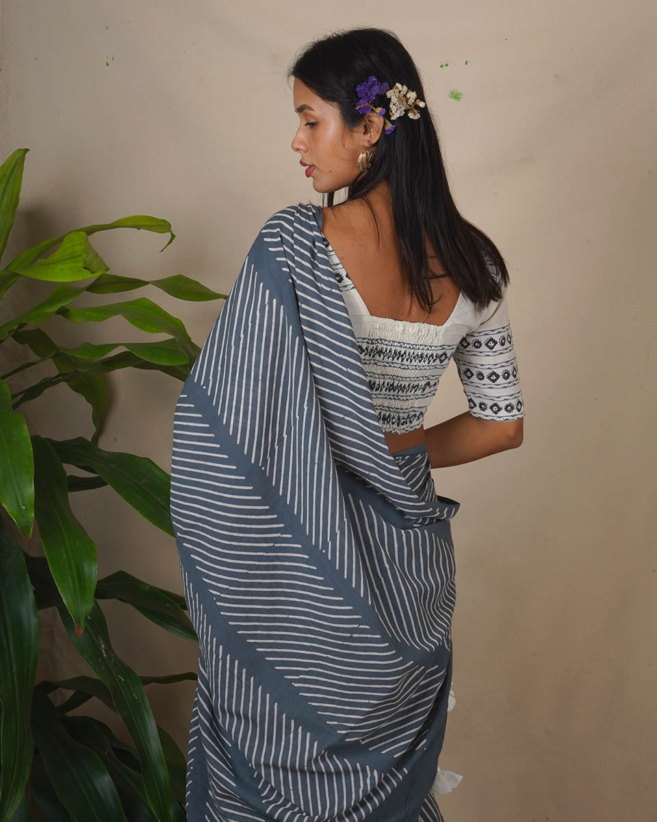 The Moon Smoke Grey Block Printed Saree captures the quiet elegance of a misty evening. Designed for the modern woman with a love for timeless grace, this cotton saree features hand-block printed motifs spread across a gentle grey base. Whether you’re dressing up for a saree for farewell, a relaxed saree look for work, or a weekend family event, this piece fits in effortlessly.
