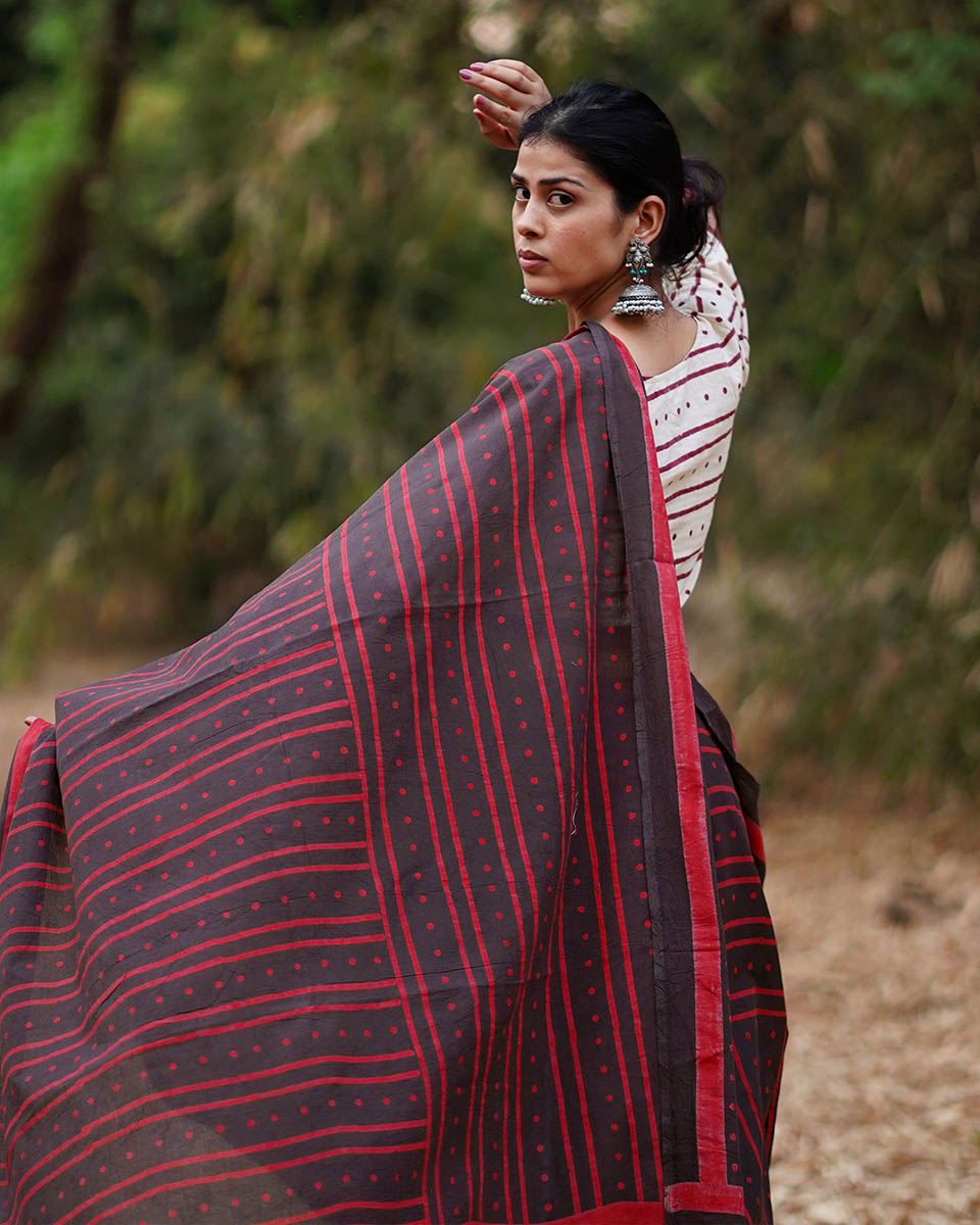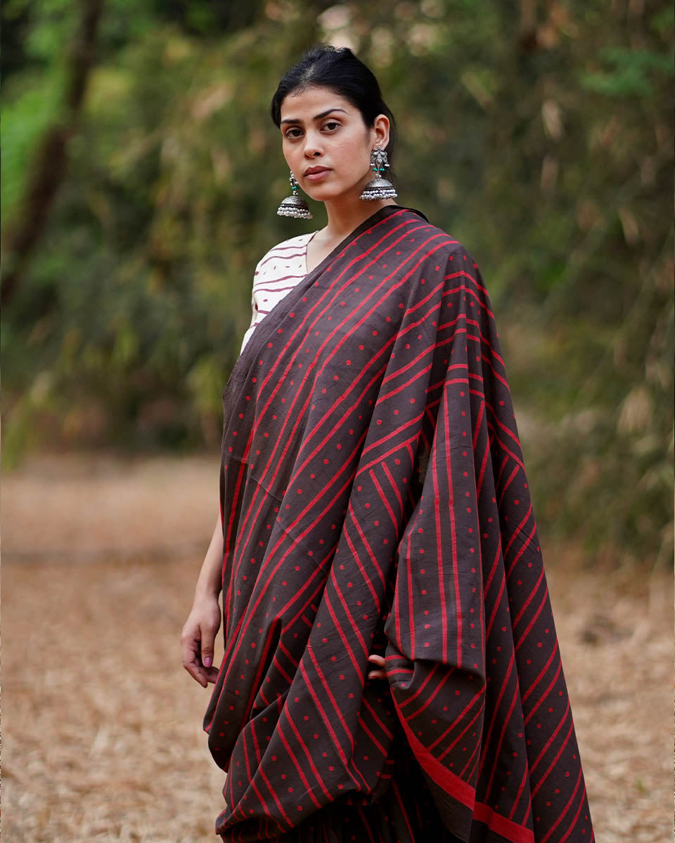 There’s something effortlessly graceful about earthy hues, Nadiya Kinare Brown Hand Block Printed Cotton Saree is a testament to that quiet charm. Crafted from soft, breathable cotton, this six-yard wonder is all about comfort meeting culture. The body of the saree showcases block-printed stripes in deep red, thoughtfully arranged to add a rhythmic, artistic pattern that catches the eye without overpowering the look. Each stripe holds the story of skilled artisans, their wooden blocks dipped in natural dyes, and their steady hands bringing tradition to life, one press at a time.
