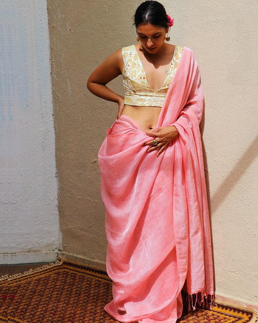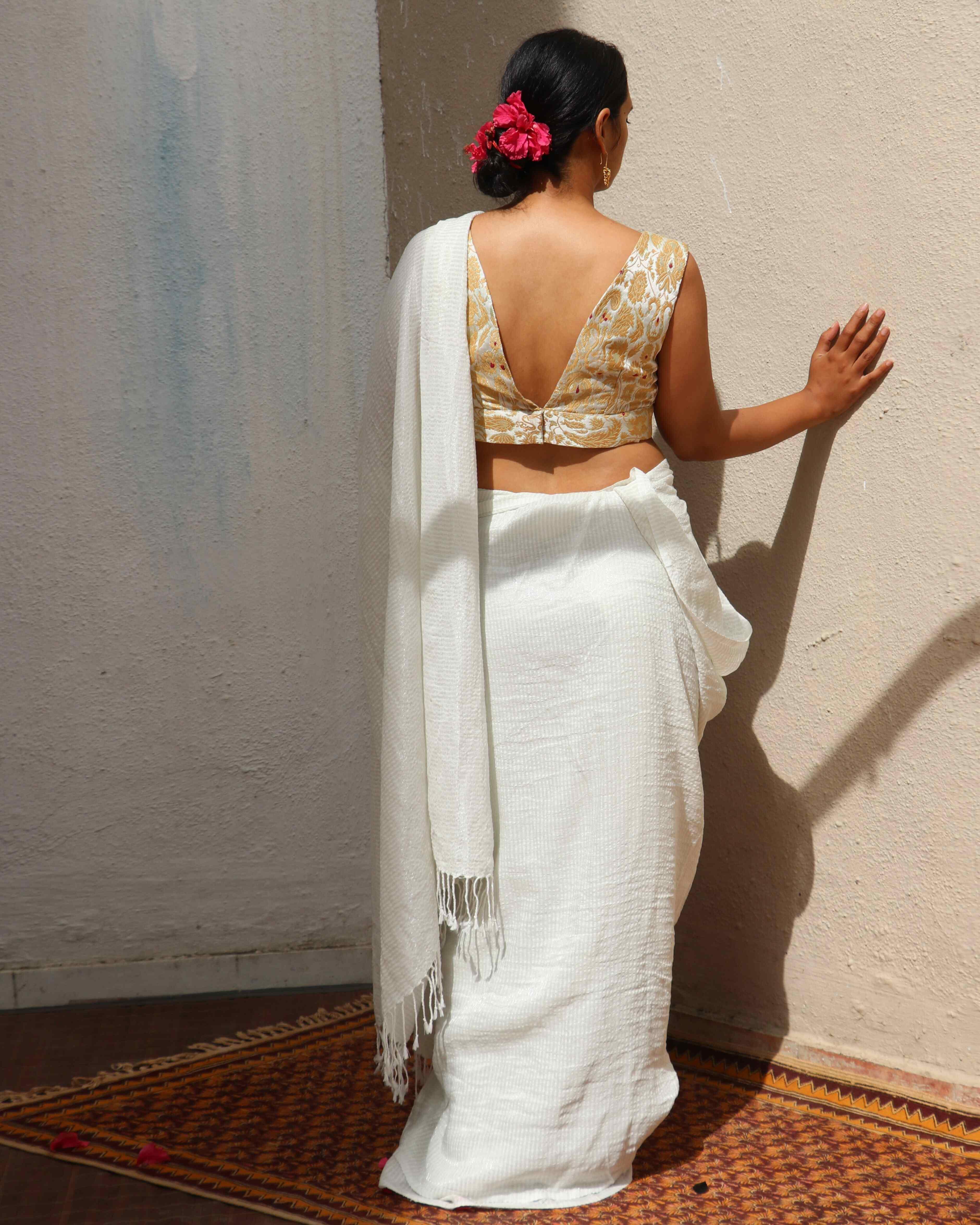 The Khimkab brocade blouse is renowned not just for its intricate designs but also for the luxuriousness of its fabric. Khimkab brocade is made from high-quality materials that contribute to its opulent feel. This fabric typically incorporates metallic threads, often in silver or gold hues, which give it a lustrous and regal appearance. The use of these metallic threads not only enhances the visual appeal but also adds a subtle shimmer to the fabric, making it perfect for special occasions and festive wear. It's this blend of fine craftsmanship and rich material that makes the Khimkab brocade blouse a go-to choice for those seeking to add a touch of grandeur and elegance to their attire.