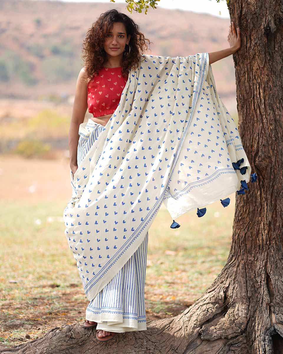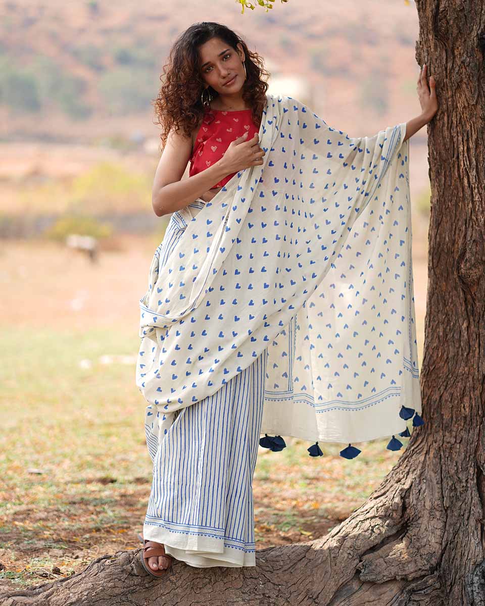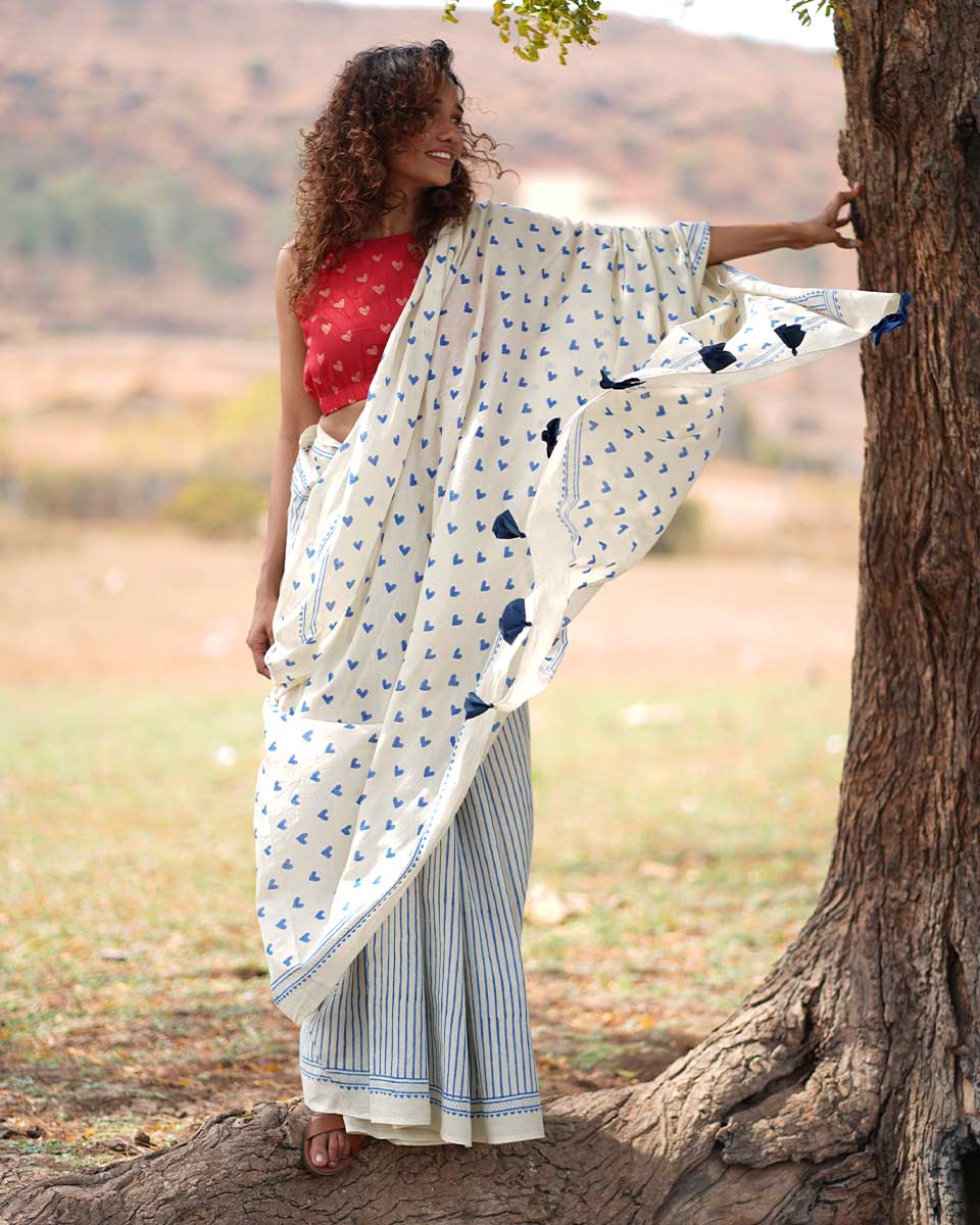 Embrace your comfort and identity with this timeless cotton saree with adorable blue heart designs, making it perfect for valentines day!