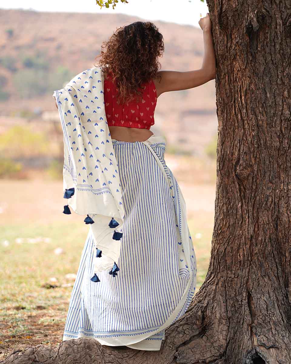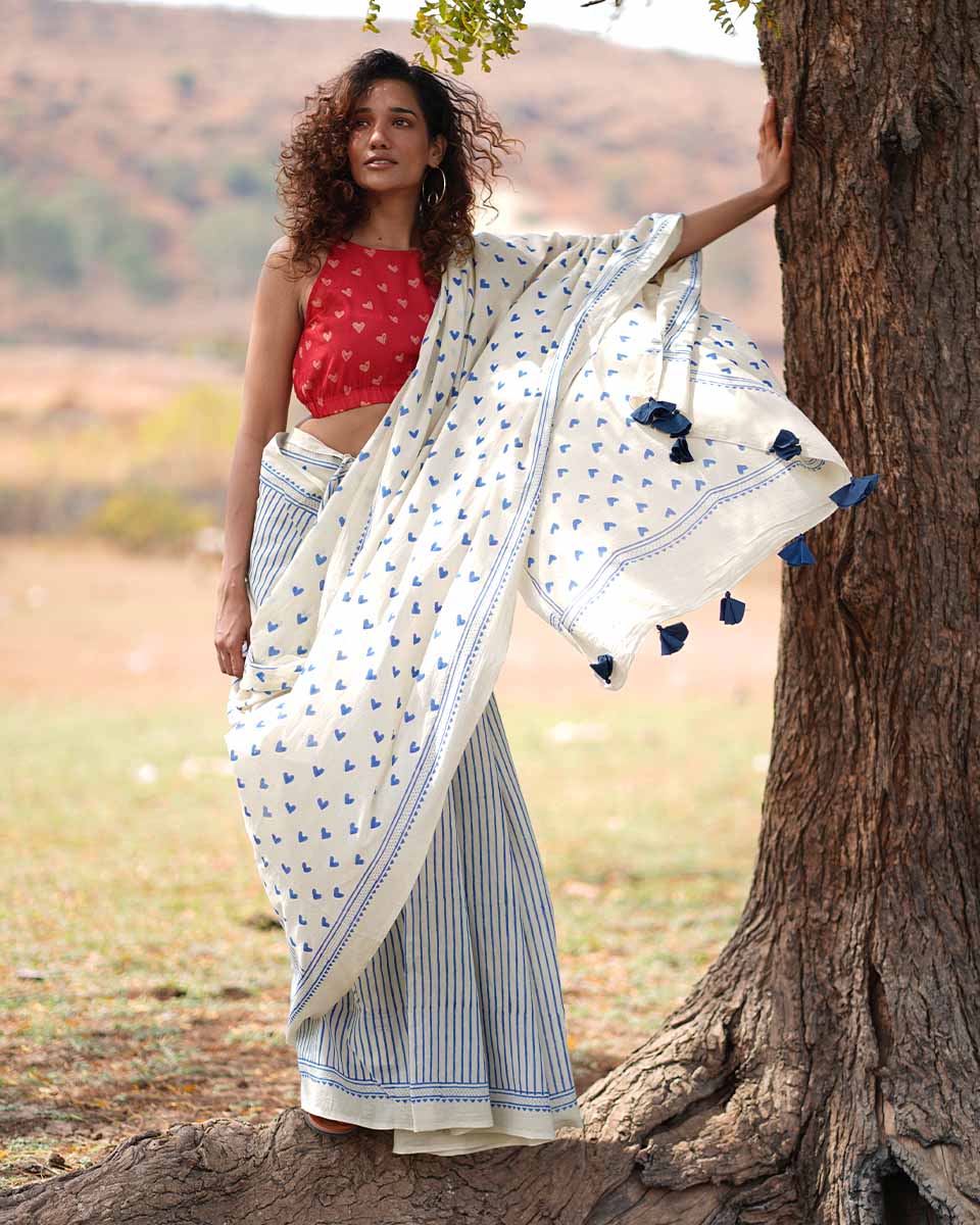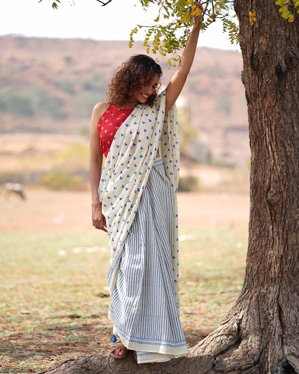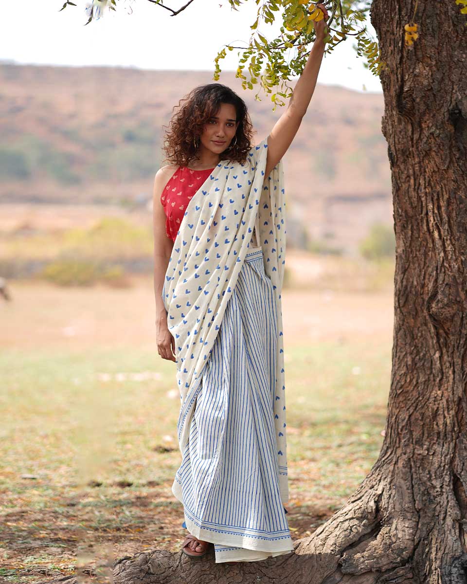 Embrace your comfort and identity with this timeless cotton saree with adorable blue heart designs, making it perfect for valentines day!