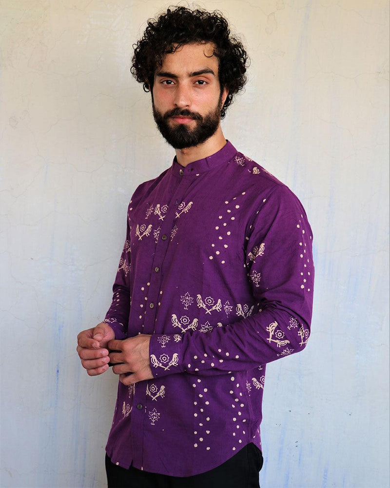 This full sleeved shirt in a vivid Purple shade features an array of traditional motifs. The cocunut shell buttons on the shirt make for an eco-conscious choice while adding a burst of color to your closet.
