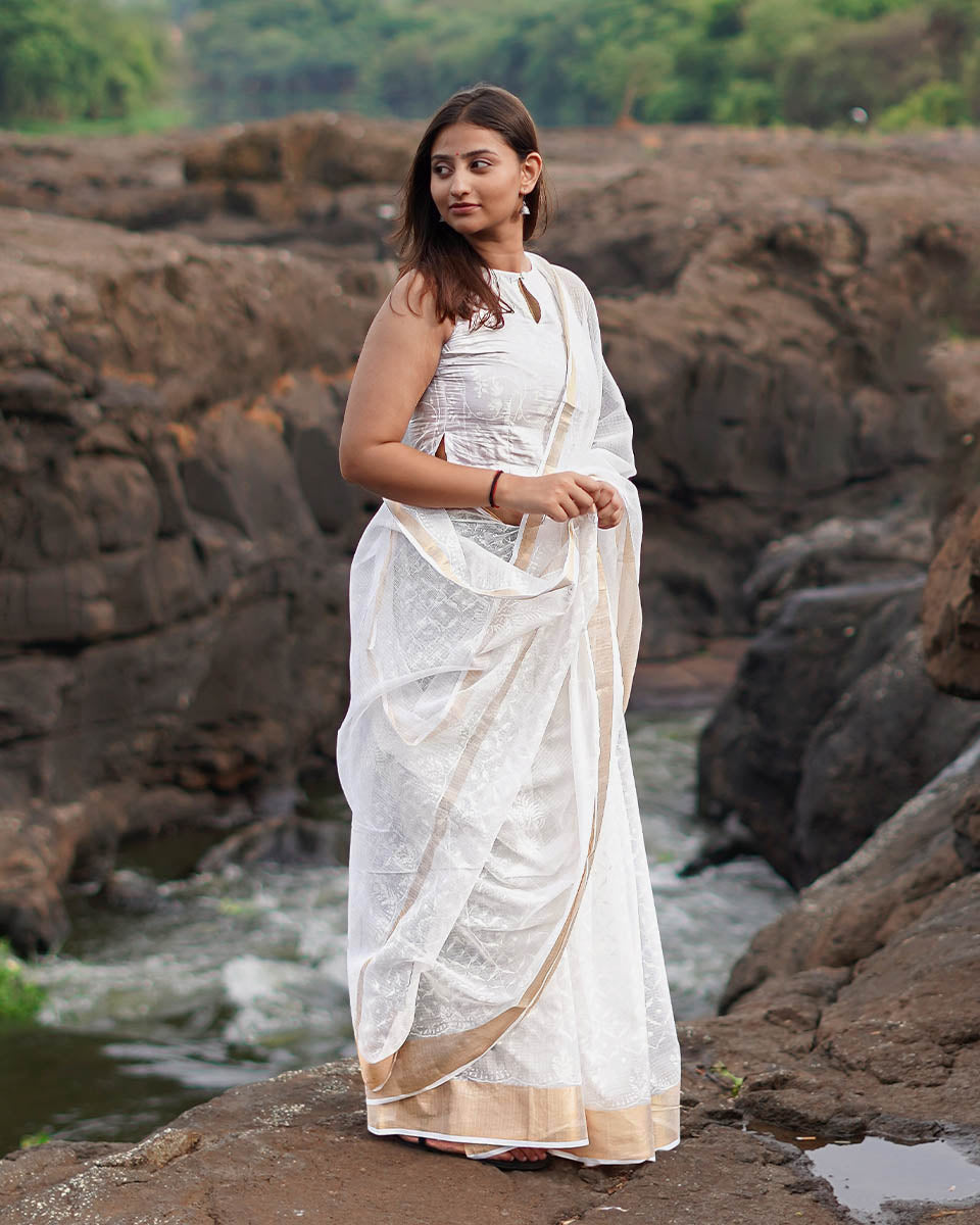 From elegant saree poses to relaxed afternoons, Seafoam Cream makes every moment photogenic. If you’re scrolling sarees online or exploring saree new design ideas, this one’s going to steal your heart.