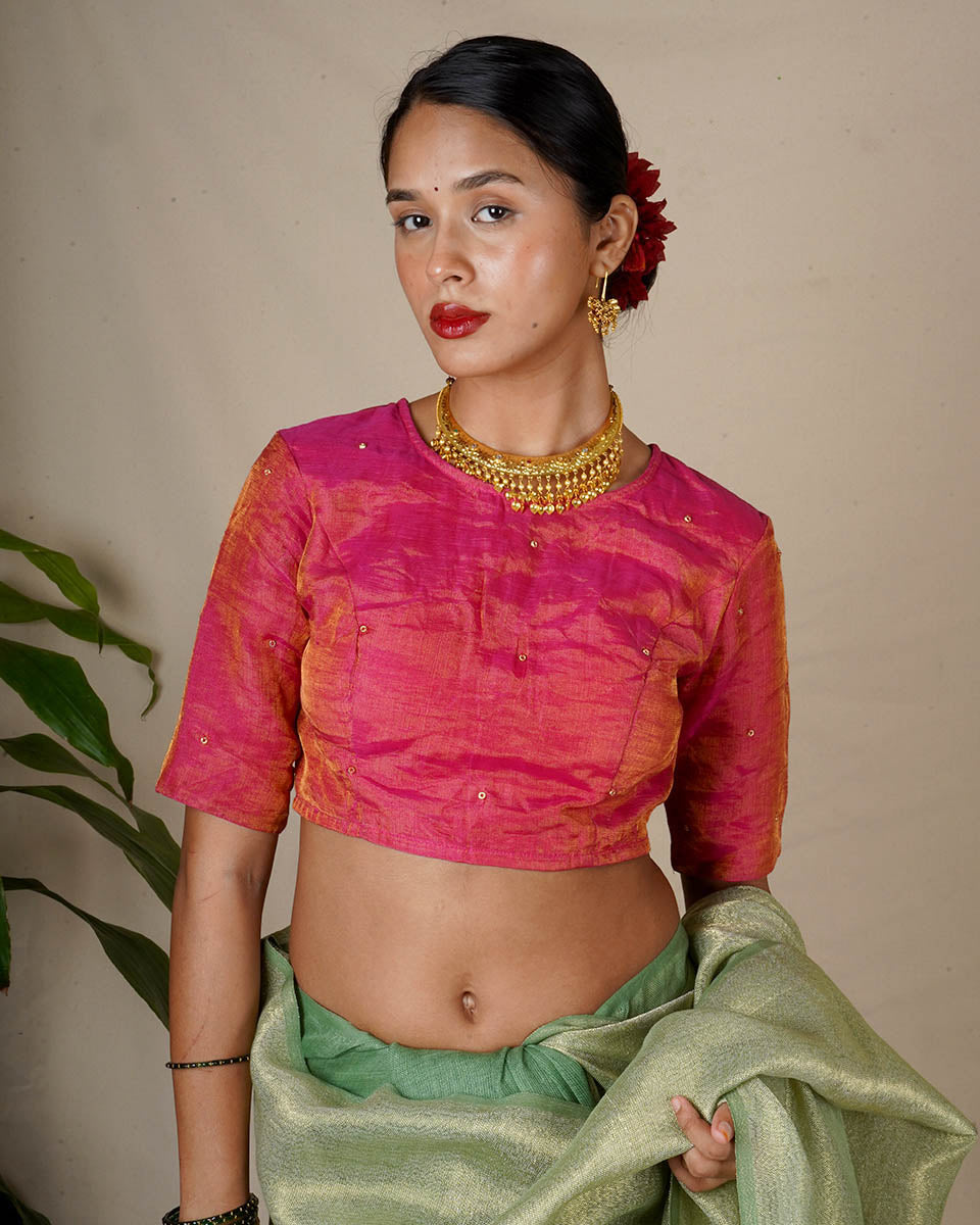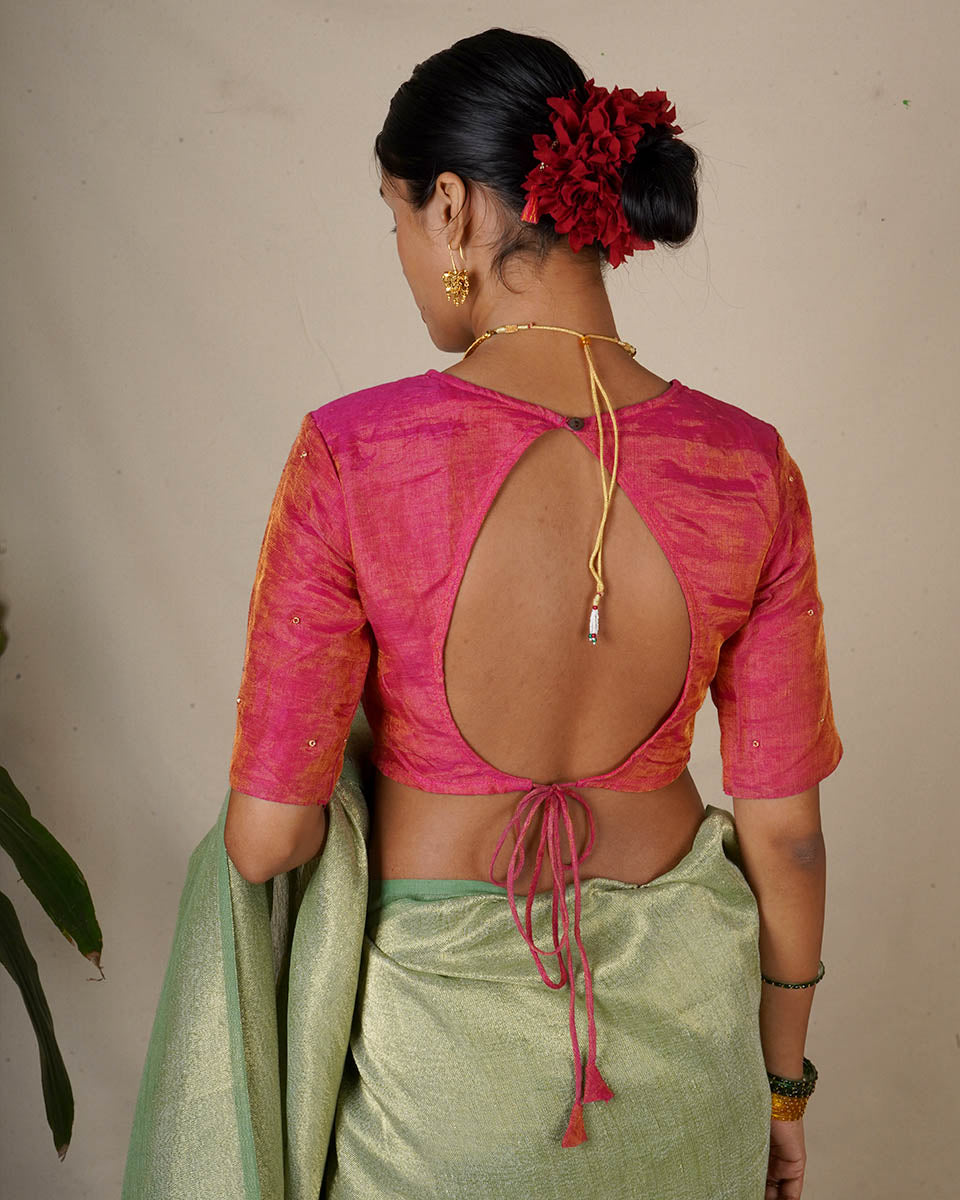 The Seher Handwoven Linen Zari Blouse is a striking blend of traditional craftsmanship and modern aesthetics, crafted for those who seek elegance with a touch of understated luxury. Made from the finest handwoven linen, this blouse offers a light and breathable texture that ensures a comfortable fit while exuding an air of effortless sophistication. The natural sheen of the linen adds a subtle elegance, perfect for elevating your saree ensemble.