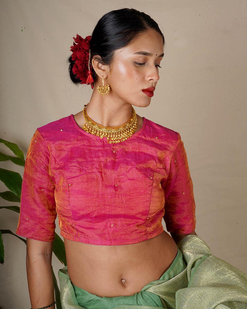 The defining feature of the Seher Blouse lies in its intricate zari work. Delicate gold and silver zari threads are intricately woven into the fabric, adorning the neckline, sleeves, and hem with a refined shimmer. This subtle metallic detailing contrasts beautifully with the simplicity of the linen, creating a harmonious balance between tradition and modernity. The zari accents lend the blouse a timeless appeal, making it versatile enough to pair with both opulent sarees and contemporary drapes.