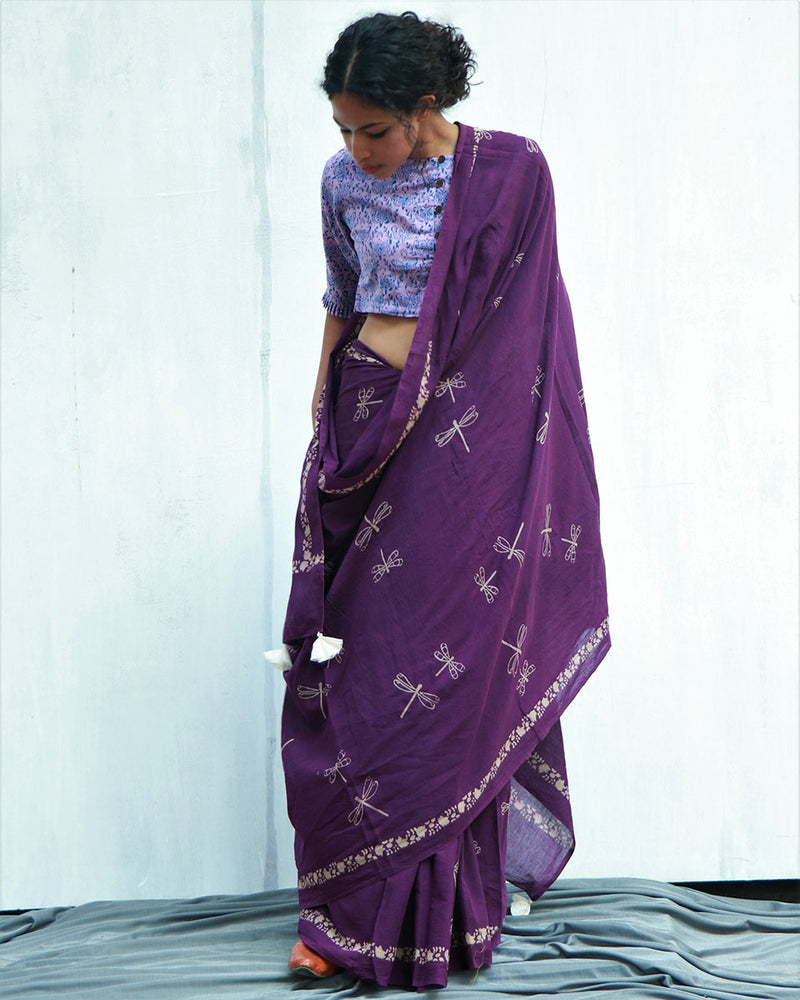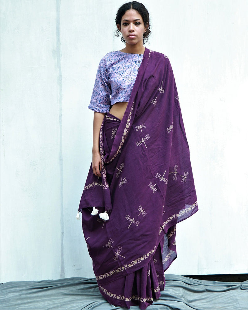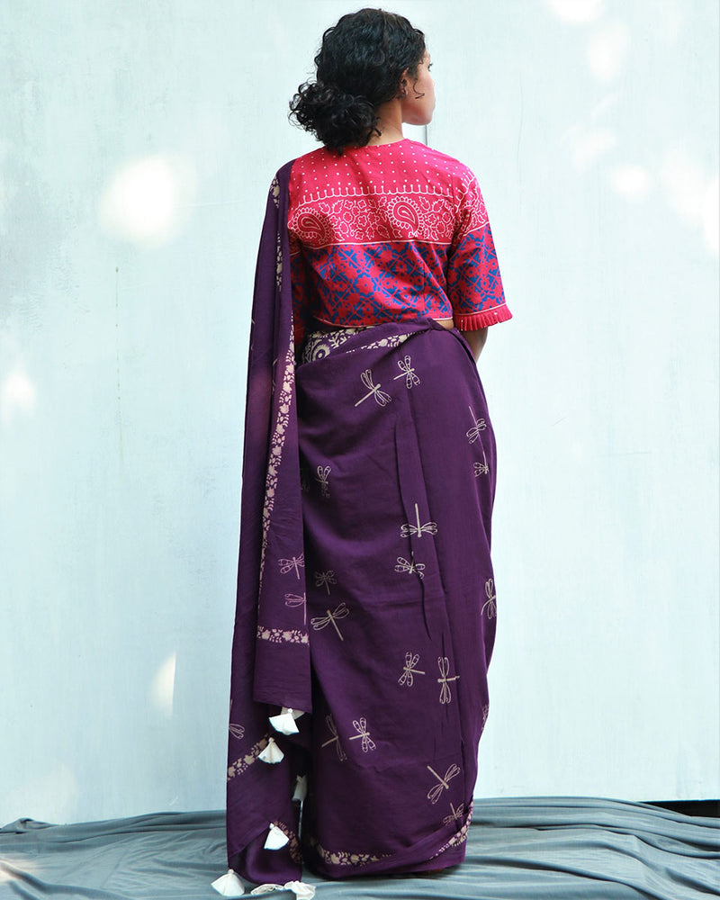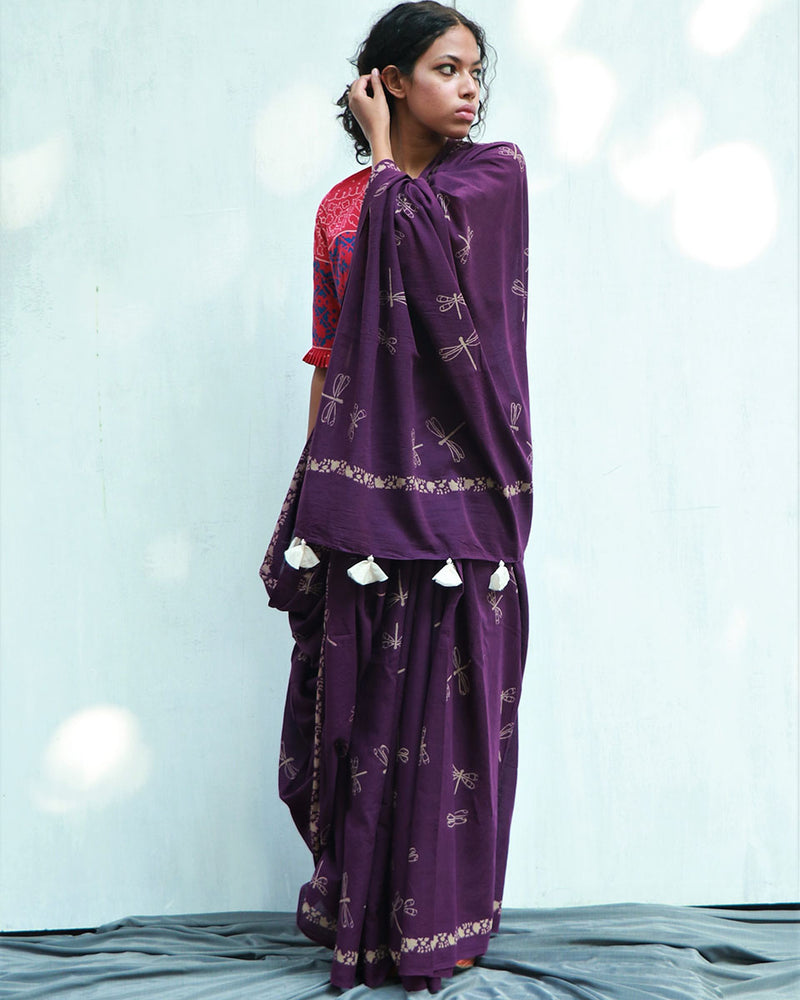 An ethnic purple saree on a soft cotton fabric. Designed with hand-printed dragonfly motifs all over along with the white tassel highlighting at the edge sure gives you the way to the plethora of nostalgic good old days.