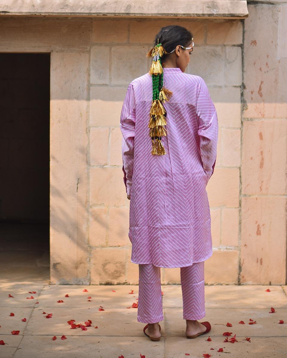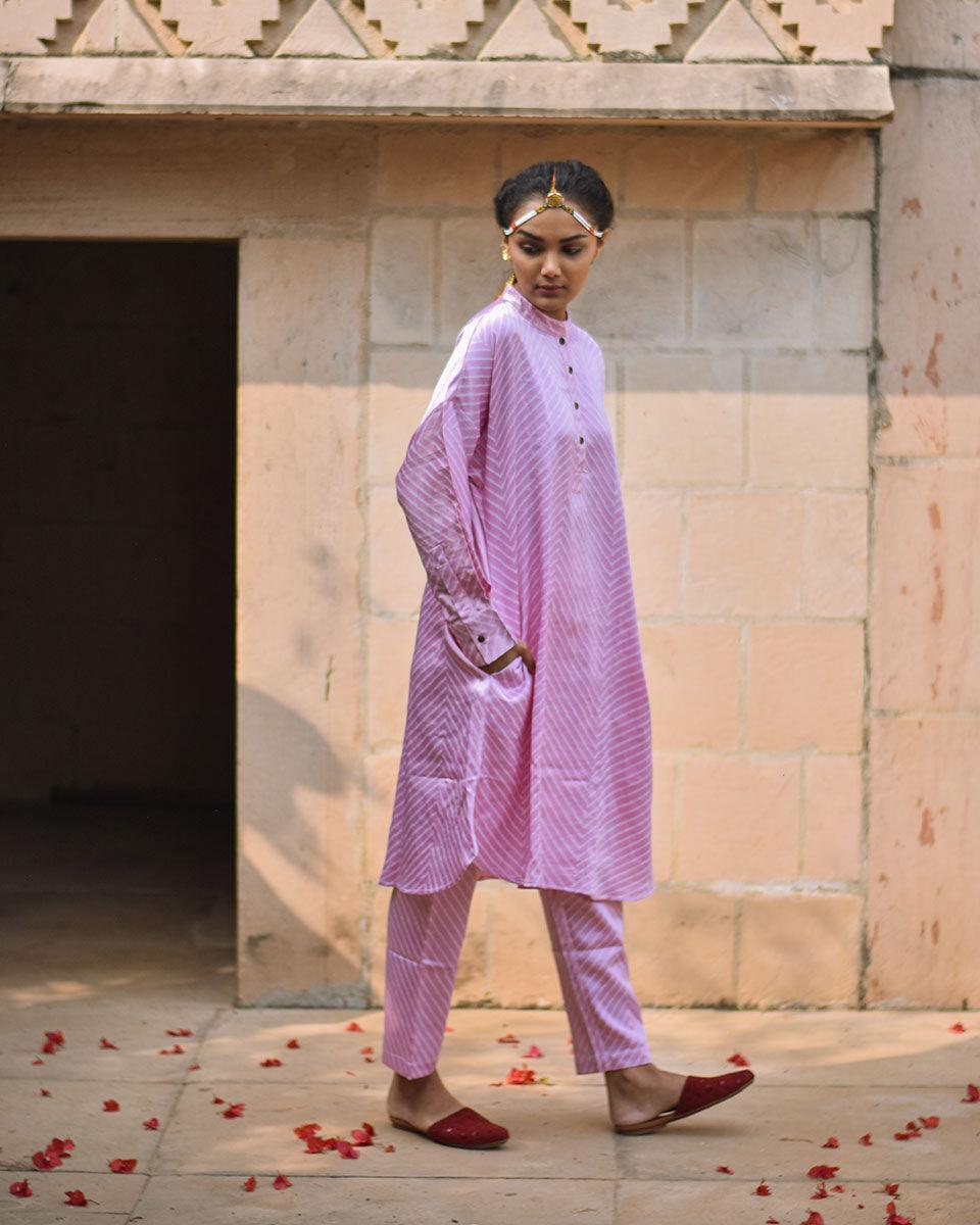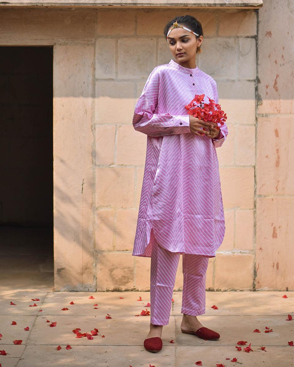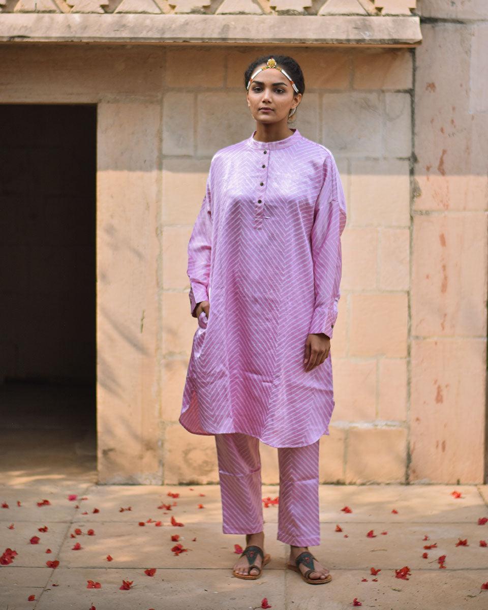 Elevate your festive and formal wardrobe with the luxurious Soft Pink Striped Block Printed Mashru Silk Kurta Set. This elegant kurti set for women is crafted from lustrous Mashru silk, known for its soft touch and subtle sheen. Designed in a soothing pink hue with delicate vertical stripes and hand block printed detailing, the kurta features a flattering straight cut, round neckline, and full sleeves for a graceful silhouette. The matching pants complete the coordinated look, making this kurti pant set a refined choice for celebrations, evening gatherings, or festive occasions.