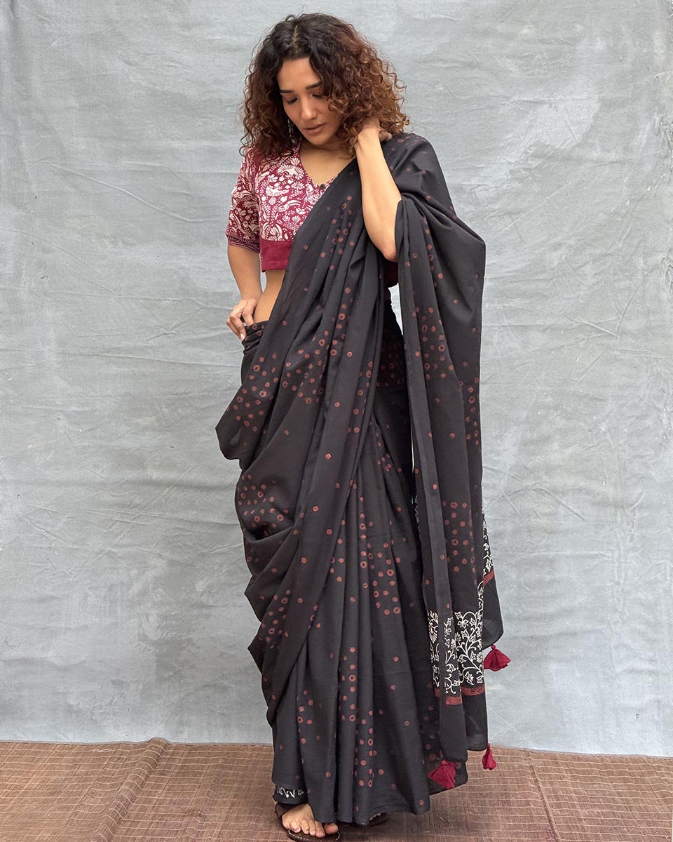 Song of Soil Black Block printed Cotton Saree