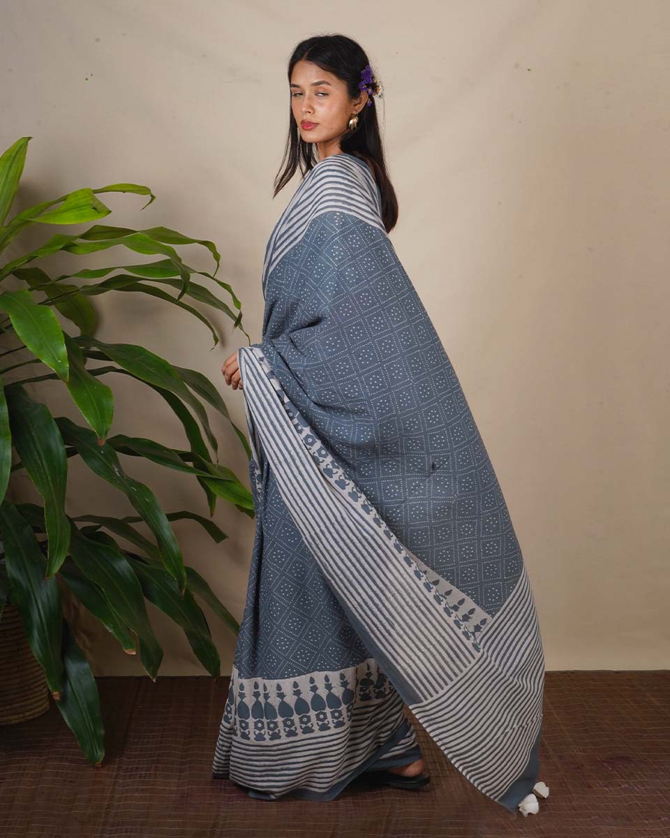 Designed with grey cotton, this saree offers comfort and a graceful drape that is fuss-free and easy to carry throughout the day. Pair it with a tailored silk blouse design for a more elevated vibe, or match it with a simple cotton top for a minimalist, work-ready ensemble. Its elegant block-printed design transitions beautifully from traditional saree styles to contemporary half-saree experiments, making it an adaptable piece for every closet.