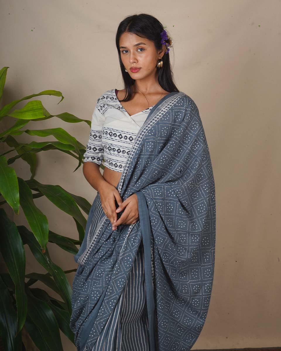 The Storm Kiss Blue Grey Printed Saree is where timeless tradition meets cool, contemporary chic. Its moody grey base adorned with abstract patterns captures attention in the best way, making it ideal for evening celebrations, semi-formal events, or wedding occasions. This saree for women is a true statement piece in any saree collection, offering a balanced mix of heritage charm and modern design. Its lightweight, breathable cotton fabric allows for easy saree draping, making it a comfortable choice for long celebrations and festive nights. The neutral grey shade makes it perfect for a saree for wedding guest, a saree for farewell parties, or a saree for reception events. Its color-blocked pallu adds depth and allows countless saree poses for memorable photographs.